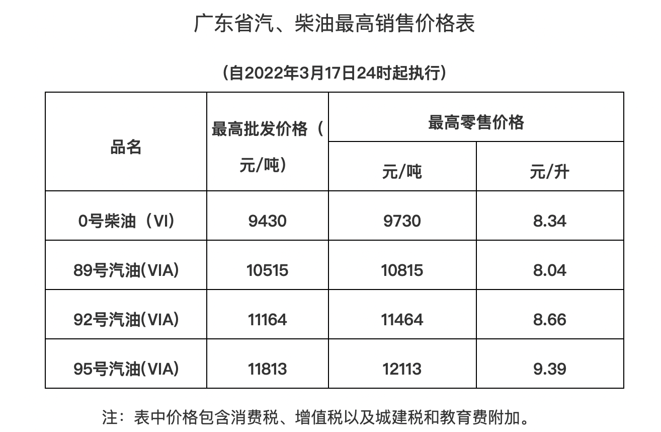 广东省油价如何调整?据广东发展改革委消息,在现行价格的基础上,广东省汽、柴油价格每吨分别提高750元和720元。调整后,广东省成品油0号柴油、89号汽油、92号汽油、95号汽油最高零售价分别为9730元/吨、10815元/吨、11464元/吨、12113元/吨,折升价分别为8.34元/升、8.04元/升、8.66元/升、9.39元/升。