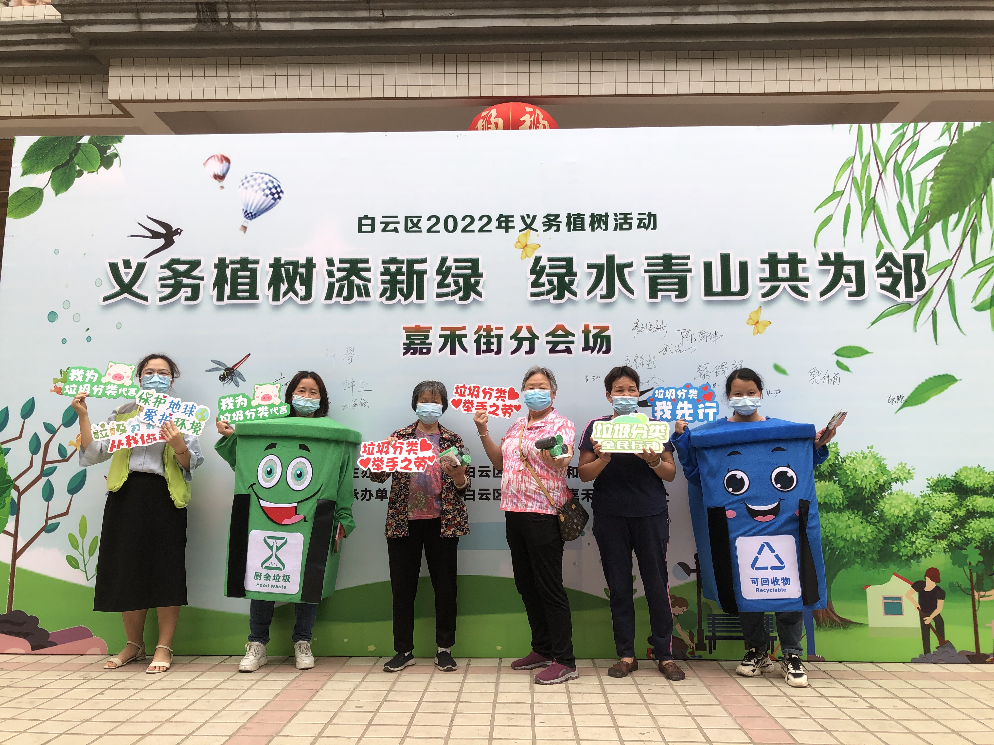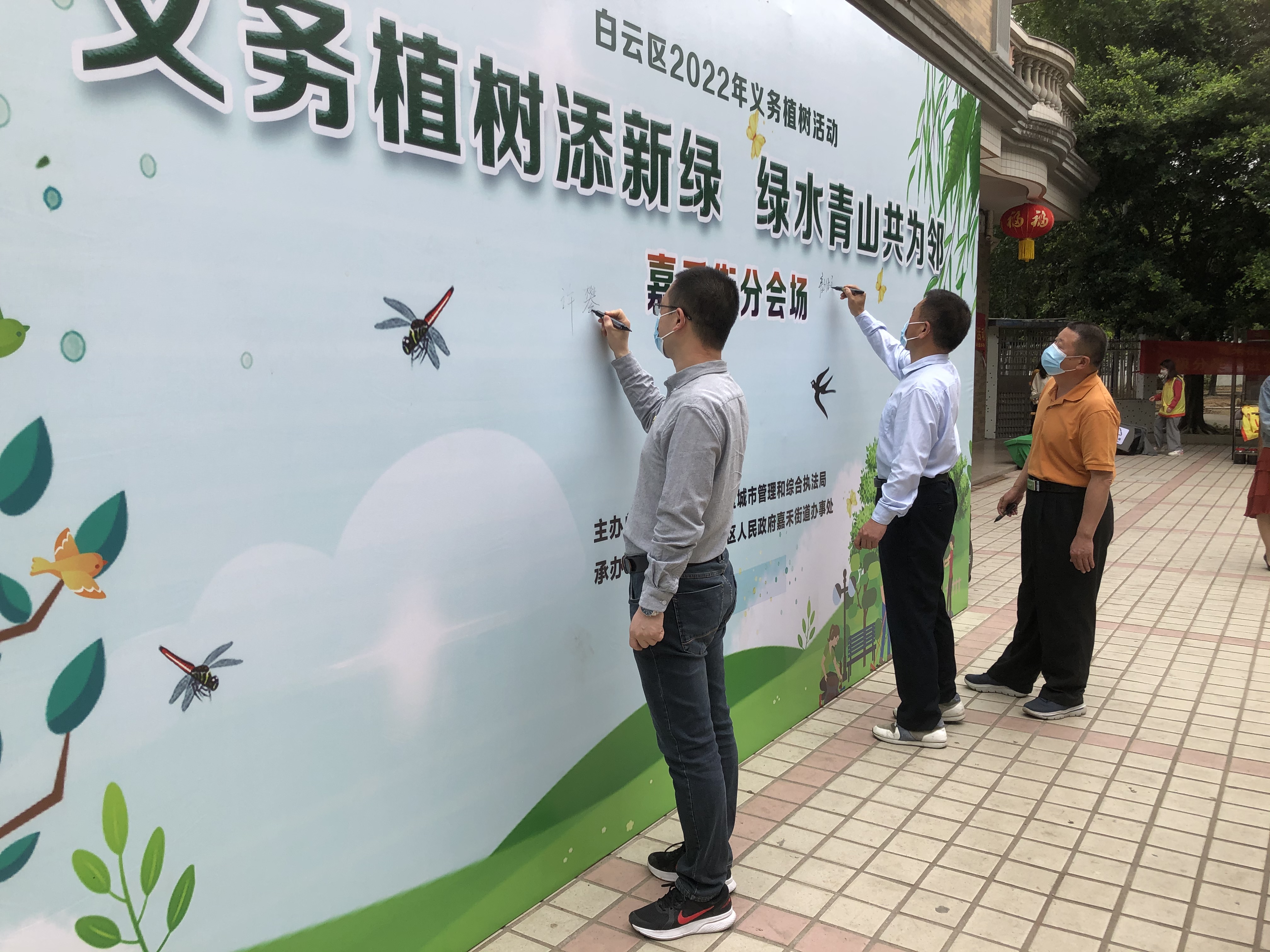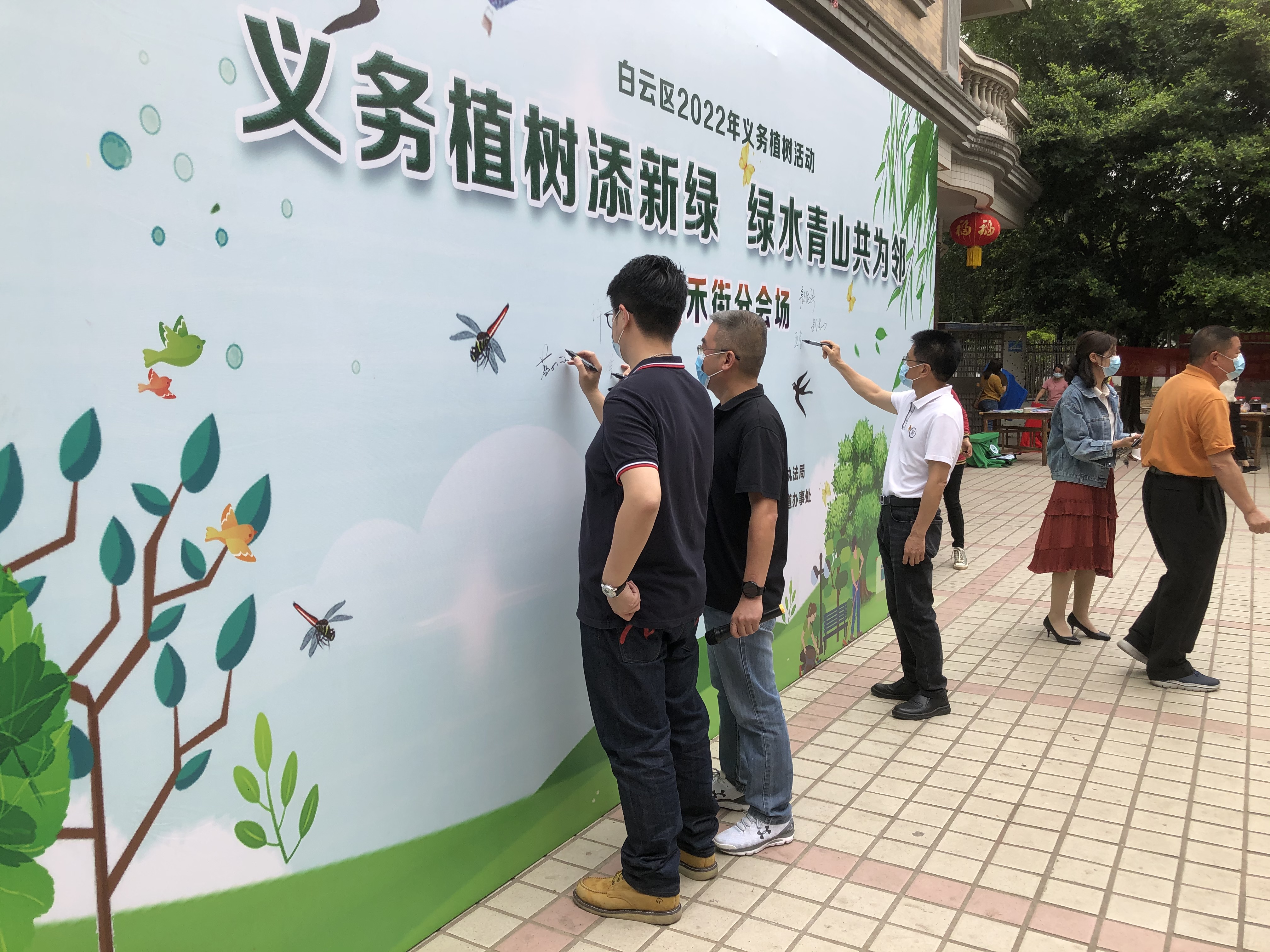 众人在植树活动背景板签名,积极参与植树造林