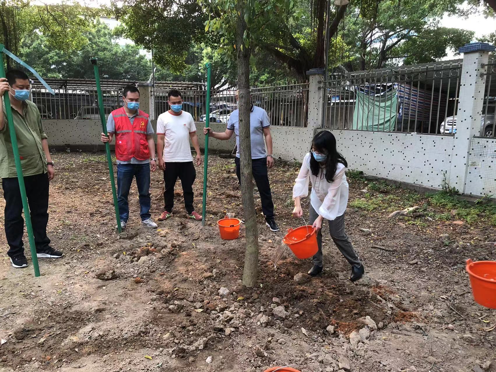 扶苗、挥锹、培土、浇水……众人纷纷撸起袖子,热情高涨,现场一派繁忙景象。经过近1小时的互相配合,大家栽种下近30棵樟树、木棉、白兰、柚子、桂花等树苗,一片盈盈新绿在春风中展现生机勃勃。