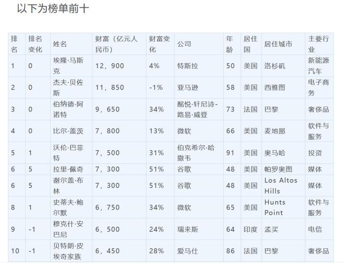 亚马逊的杰夫·贝佐斯以1.19万亿元位居第二,比去年下降了1%。LVMH(酩悦·轩尼诗-路易·威登集团)的伯纳德·阿诺特增加了2000多亿元,以9650亿元位居第三。