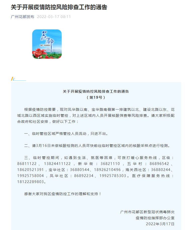 广州市花都区新型冠状病毒肺炎疫情防控指挥部办公室17日发布《关于开展疫情防控风险排查工作的通告(第19号)》: