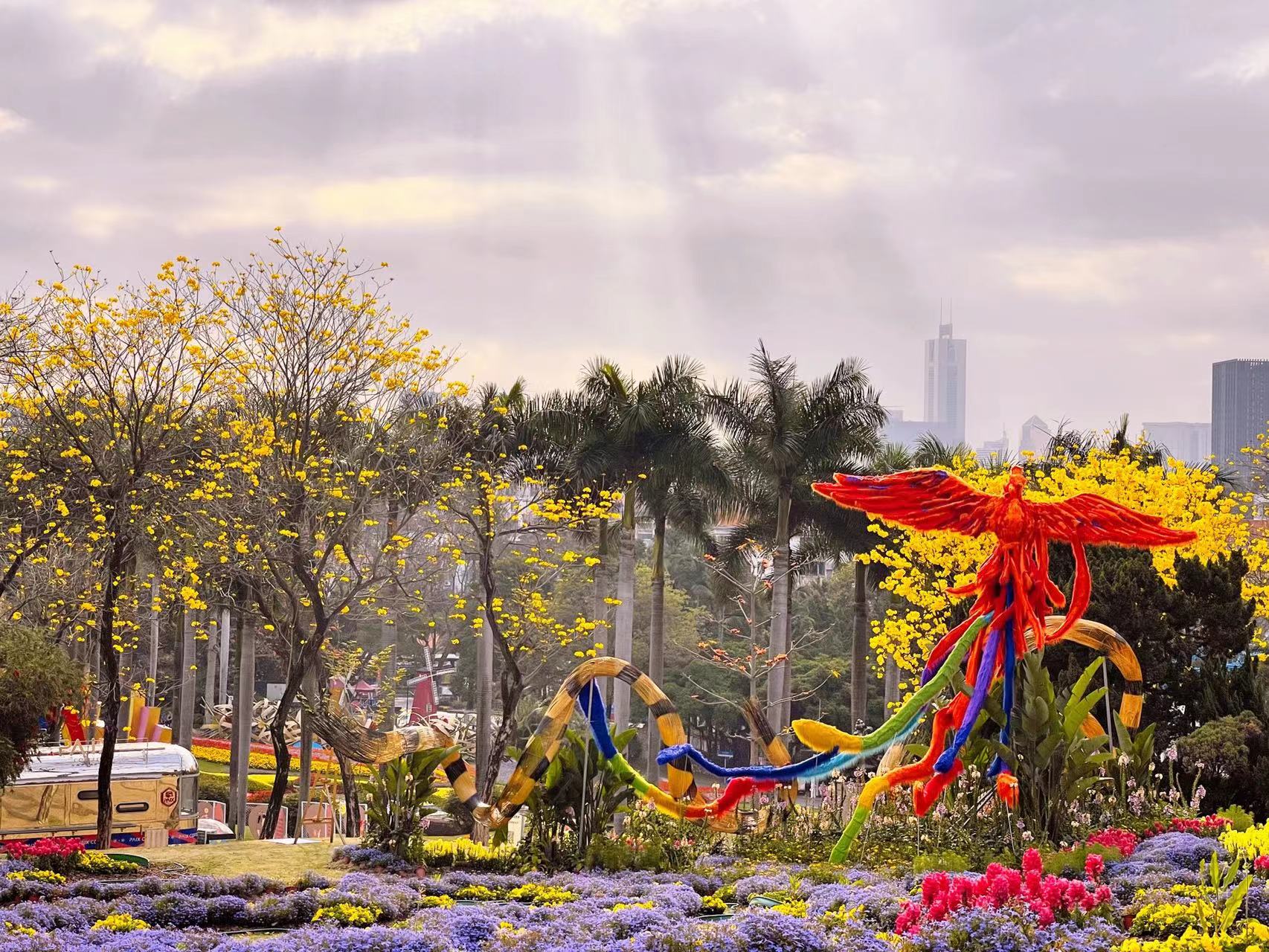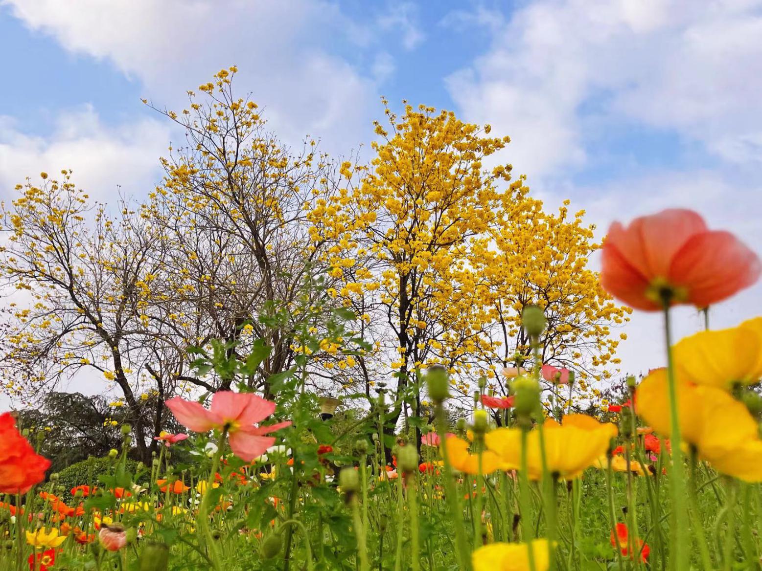 云台花园谊园草坪上是金黄色花簇挂满枝头的黄花风铃木,与凤凰花境映成趣,在这场春风里肆意起舞,摇曳生姿;来拍照的青春靓丽小姐姐在风铃花下成为景区内一道独特的风景线。