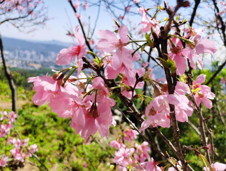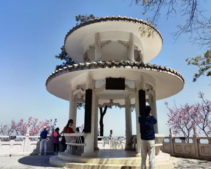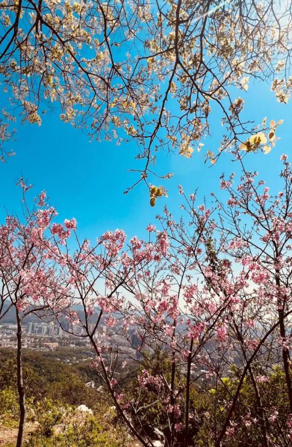 摩星岭顶踏春赏樱,欣赏早樱之美,一览羊城风光。通往摘斗亭的小路边,樱花树三五成丛,红花满树,花团锦簇。樱花的粉红同天空的湛蓝交相辉映,穿上汉服来一场顶峰春日之约。
