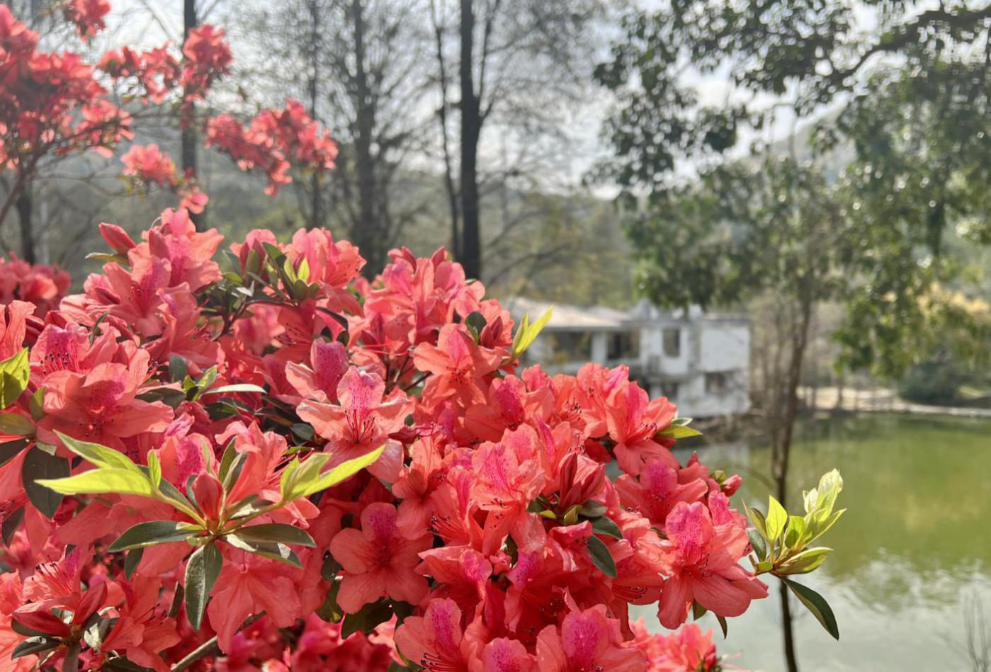 明珠湖附近杜鹃花已盛开,其中以映山红和毛杜鹃开的最盛,红的似火,粉的似霞,随风感受阵阵花香,可谓杜鹃花似海,满山留异香。