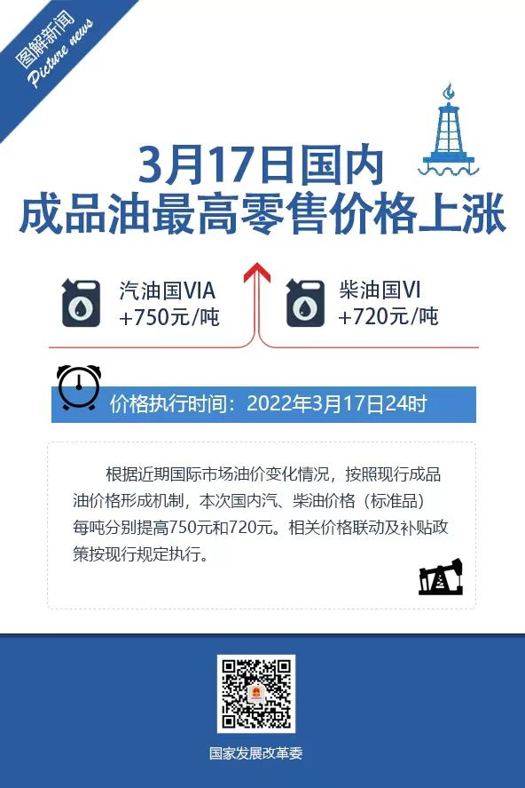 3月17日,国家发改委发布消息称,国内成品油价格按机制上调 。本次油价调整具体情况如下:国内汽、柴油价格每吨分别提高750元和720元。