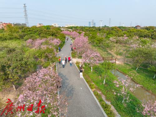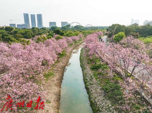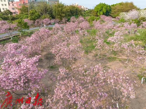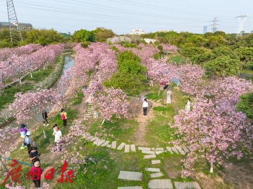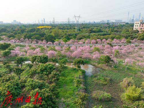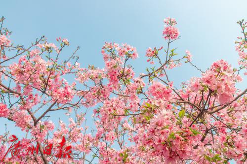 近日,海珠湿地公园的广州樱进入盛花期,远望如一片粉色的云霞,近看密密麻麻的花瓣挂满枝头,如一群群可爱的小蝴蝶在翩翩起舞。据了解,海珠湿地十亩樱花园位于南门附近的凫鹭泾,以广州樱为主,前期开花的绯红樱已经谢幕,目前正是观赏广州樱的最佳时间,天气原因预计花期到周末左右。园区提醒市民入园赏花,需提前在“海珠湿地”公众号预约、购票,错峰入园,在赏花拍照的同时要注意遵守防疫措施,规范佩戴好口罩,注意个人防护。