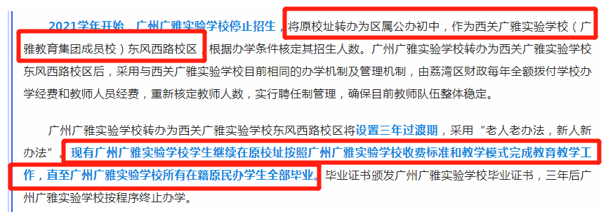 根据此前报道,从2021学年开始,办学19年的广州广雅实验学校从民办转办为公办学校,作为西关广雅实验学校(广雅教育集团成员校)东风西路校区,根据办学条件核定其招生人数。