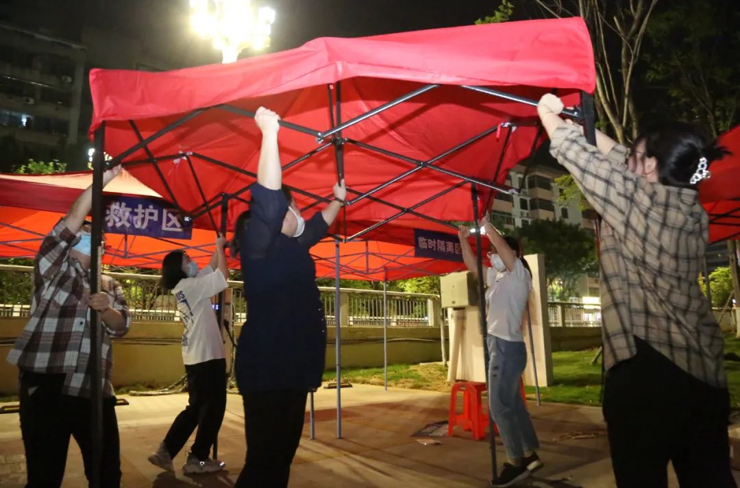 18日夜,韶关市发出《关于在武江区、浈江区、曲江区开展全员核酸检测工作的通告》。当天夜里,一支由医护人员、党员干部、志愿者等组成的5000多人的队伍迅速“集结”,为打赢全员核酸检测这场硬仗做准备。一批由镇(街)干部、社区工作人员和志愿者组成“先头部队”,于当夜率先奔赴“战场”,连夜为战斗准备物资、搭建“要塞”。
