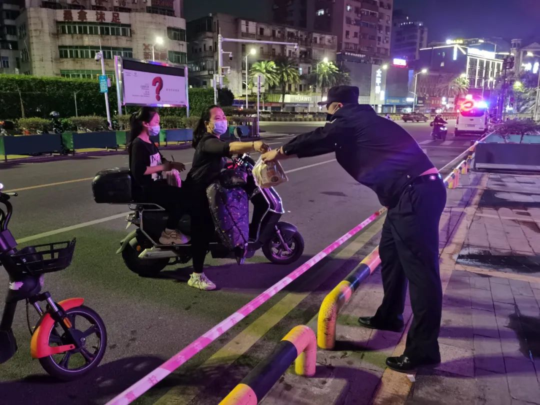 3月16日深夜,韶城街头晚风渐凉,行人车辆稀少。却有一辆电动车缓缓驶近了风度名城门口的警戒线,衣着单薄的妈妈顶着深夜的寒风,稚气的少女怀里紧紧护着一袋沉甸甸的食物。