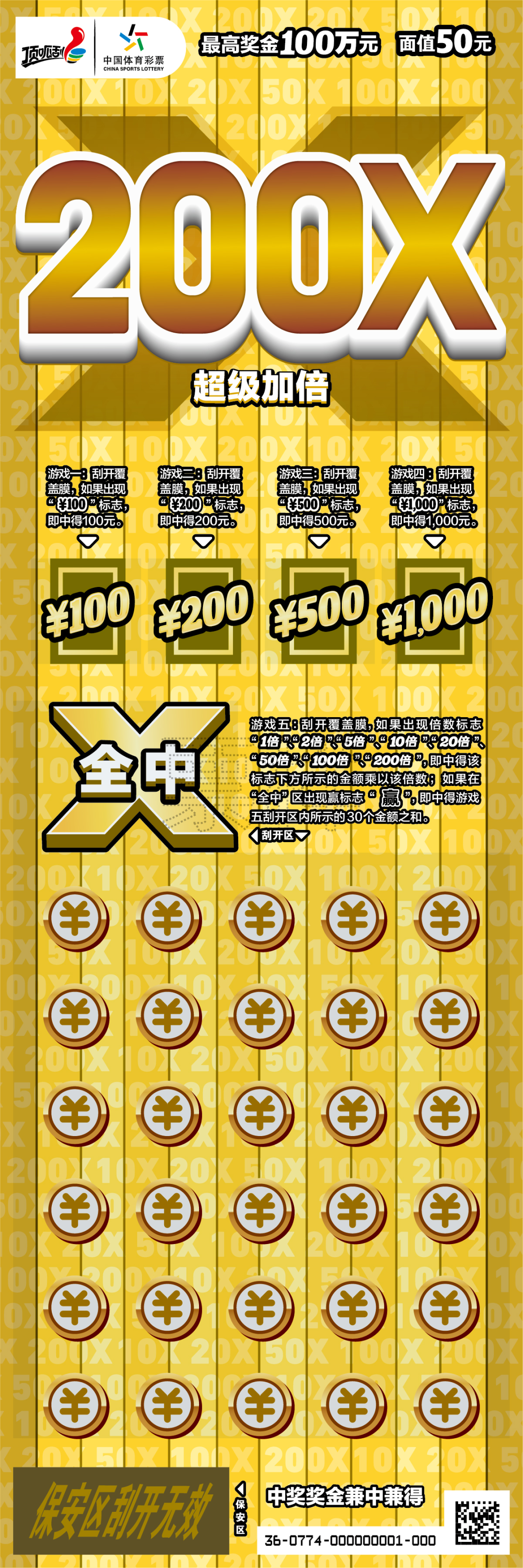 游戏一:刮开覆盖膜如果出现“¥100”标志,即中得100元;游戏二:刮开覆盖膜如果出现“¥200”标志,即中得200元;游戏三:刮开覆盖膜如果出现“¥500”标志,即中得500元;游戏四:刮开覆盖膜如果出现“¥500”标志,即中得500元;游戏五:刮开覆盖膜,如果出现“1倍”“2倍”“5倍”“10倍”“20倍”“50倍”“100倍”“200倍”的倍数标志,即中得该标志下方所示的金额乘以该倍数,如果在“全中”区出现“赢”标志,即中得游戏五刮开区内所示的30个金额之和,中奖奖金兼中兼得,最高可中100万元。