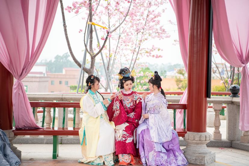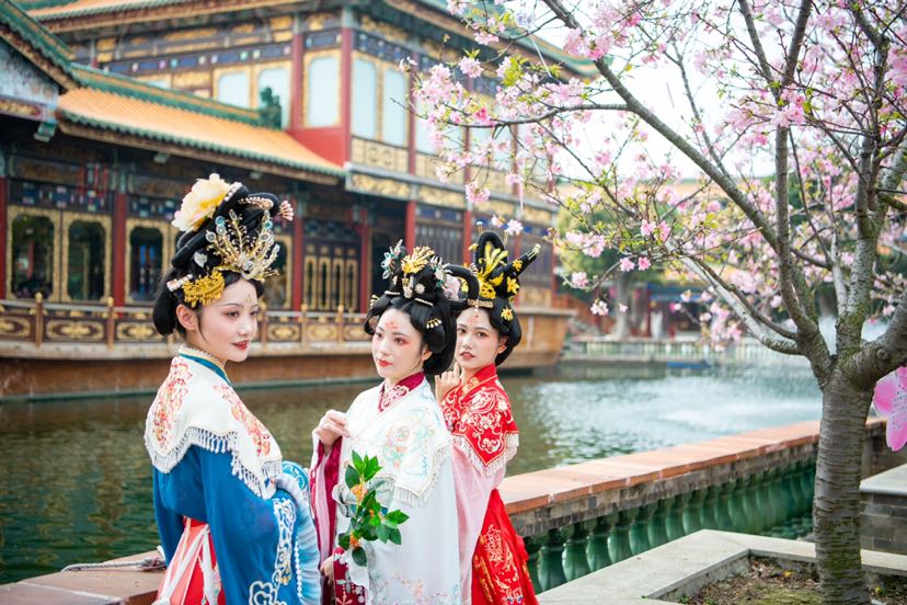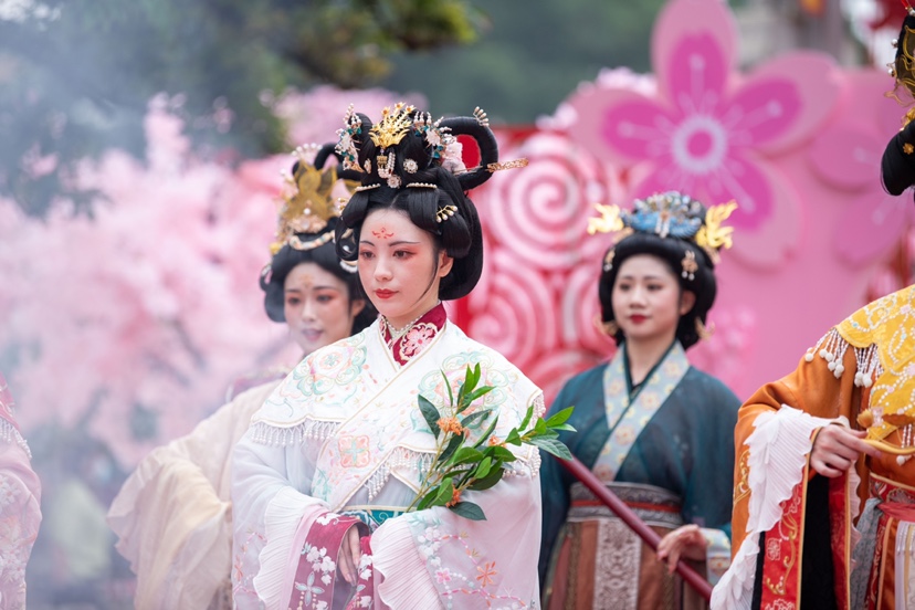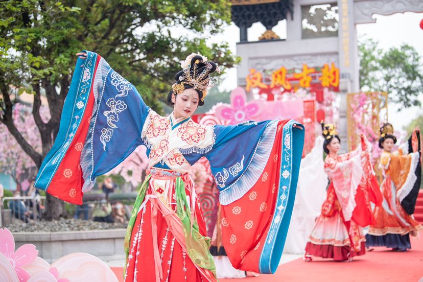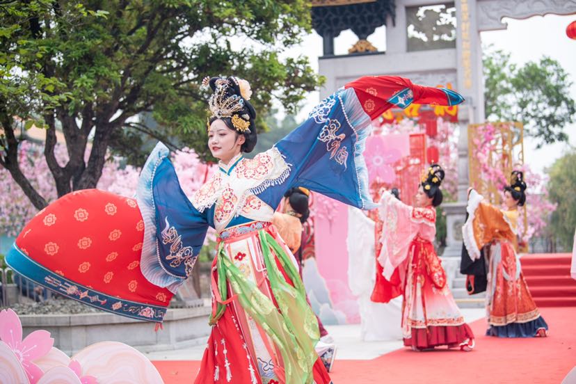 漫天樱舞,演绎汉风古韵;春花似海,陶醉如织游人。开幕式以汉服演艺、情景歌舞、传统戏曲、方阵巡游等方式展示中国樱花文化的独特魅力。十位佳人衣袂飘飘,群芳赴会,一曲宝墨霓裳,倾情演绎《天仙瑶池会》;红楼绮梦绕名园,汉服情景剧塑造红楼梦里诗礼簪缨的“十二金钗”,清歌起舞,百媚丛生;更有传统粤曲,奏响“才子佳人花好月园”的赏樱浪漫旋律。
