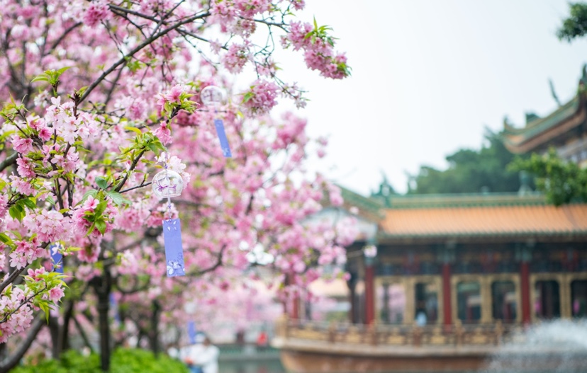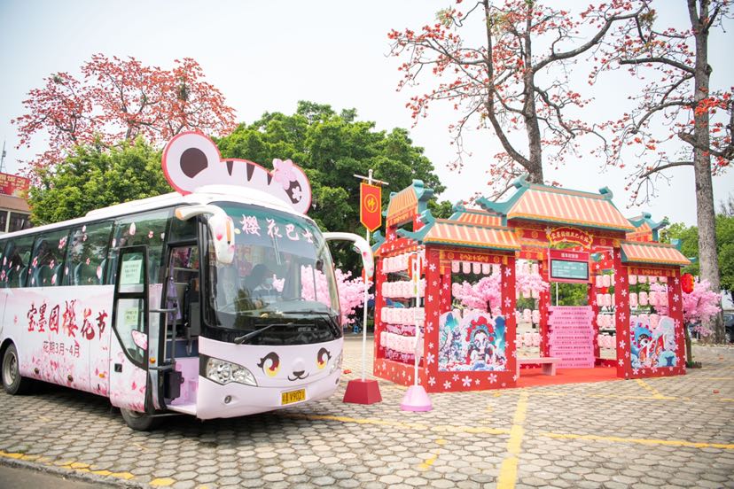 为了让游客沉浸式感受赏樱乐趣,宝墨园创新打造了一列“开往春天的巴士——樱花号”,车厢内是大片的樱花海搭配粉色灯笼、叮当作响的樱花风铃,梦幻浪漫,巴士来回往返宝墨园和南粤苑。在宝墨园正门还打造了国潮风樱花主题站台,整体造型樱花横溢、古典雅致。在宝墨园内,精心打造了一系列樱花主题的沉浸式互动拍照打卡场景,完美融入到灿烂樱花、园林古建之中,让游客们在汉风古韵的樱花美景中流连忘返。