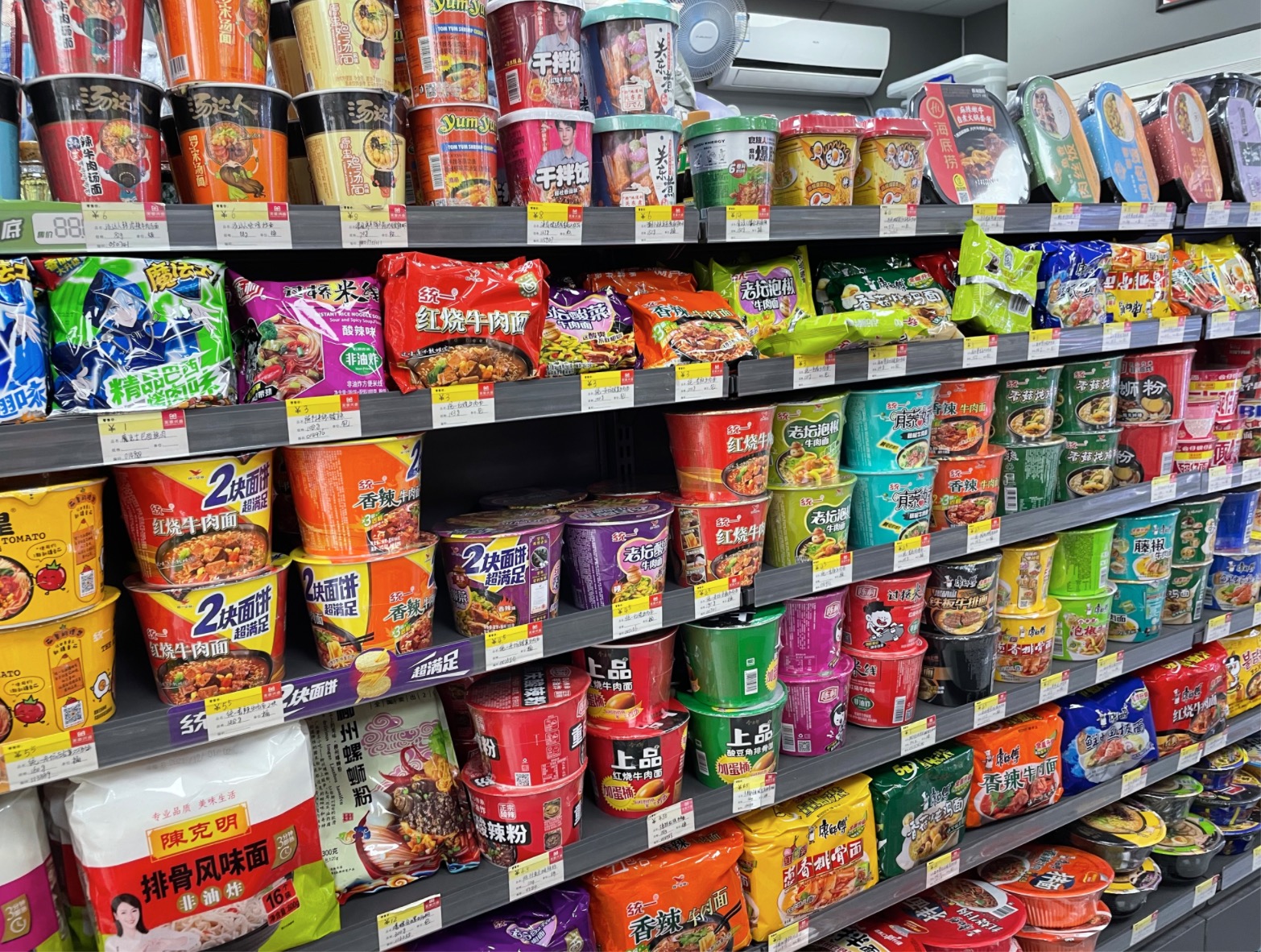 记者走访线下超市时注意到,在方便食品区域,传统泡面在货架上的陈列空间不断缩小,取而代之出现了许多新品牌;口味也由单一走向多元化,延伸至螺蛳粉、热干面、南昌拌粉、河粉、拉面等;产品价格普遍在每份6-18元的区间段。
