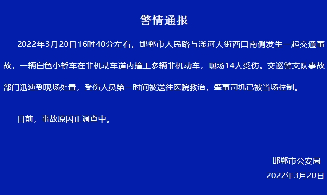 2022年3月20日16时40分左右,邯郸市人民路与滏河大街西口南侧发生一起交通事故,一辆白色小轿车在非机动车道内撞上多辆非机动车,现场14人受伤。交巡警支队事故部门迅速到现场处置,受伤人员第一时间被送往医院救治,肇事司机已被当场控制。