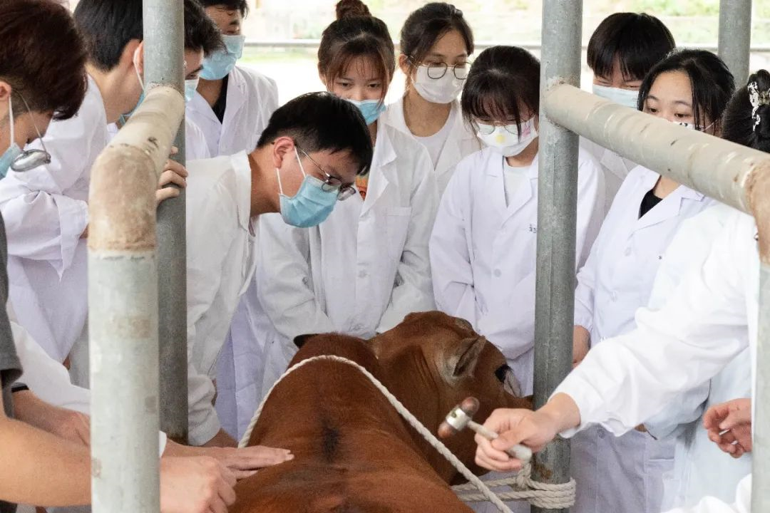 谈及网红“牛学长”,吴玄光笑着说:“它们性情温和,配合教师的教学工作,是实践课程的好帮手。以牛牛为载体,学生们得以将基础理论与临床实践相结合。”临床实践课程内容涵盖视、触、叩、听等诊断方法以及喂药、打针、抽血等治疗技术,致力于培养理论基础扎实、动手能力强的新时代兽医人才。