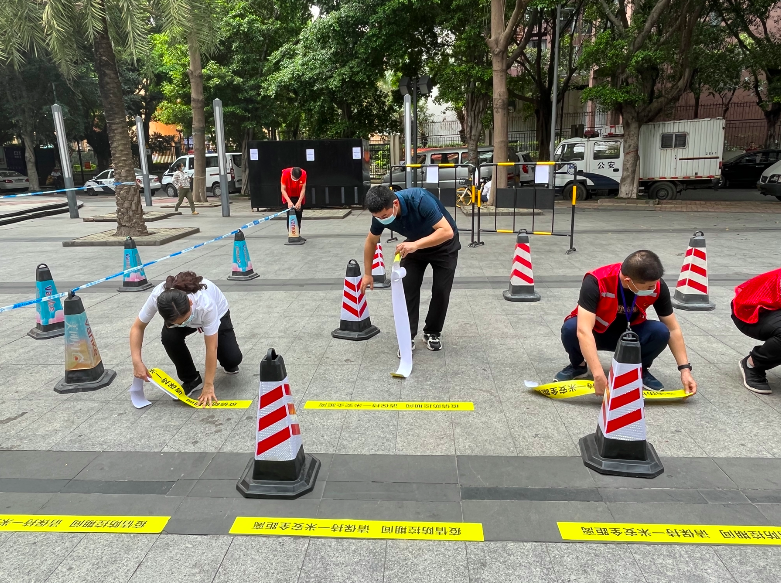 本次大规模核酸检测多方联动,荔湾区城管执法局共出动约70名工作人员,帮助桥中街开展大规模核酸检测工作。街道7个居委会和2个联社迅速启动在职党员“双报到”机制,发动辖内党员共同参与到全员核酸检测工作中。各小区物管公司组织保安队伍协助做好场地布置和现场秩序指引。