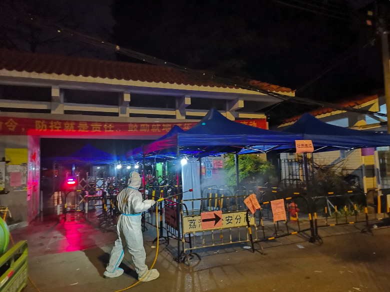 街道消毒站工作人员对检测点进行消毒。