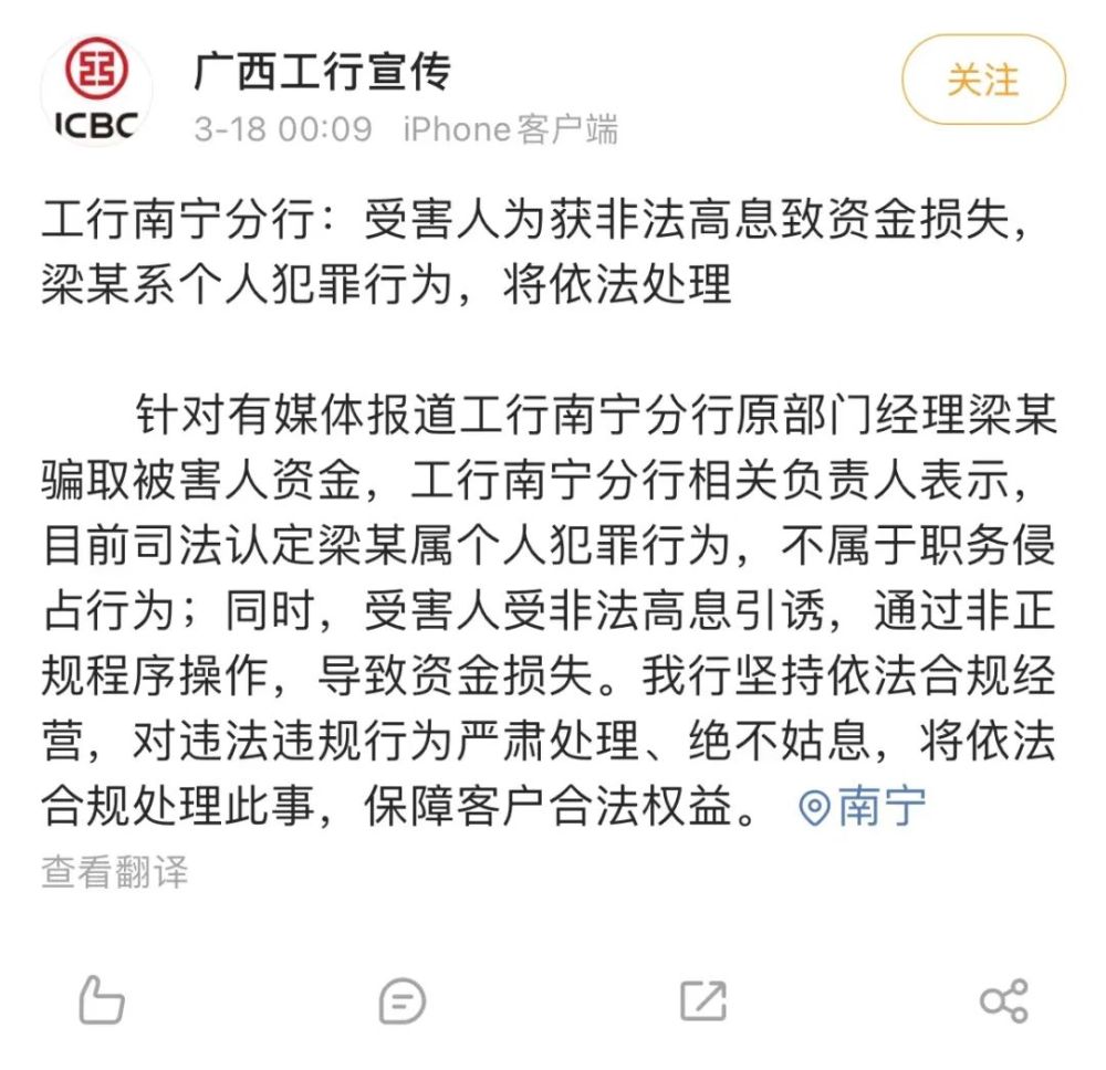对此,“广西工行宣传”微博曾回应,目前司法机关认定梁某红属个人犯罪行为,不属于职务侵占行为;同时,受害人受非法高息引诱,通过非正规程序操作,导致资金损失。