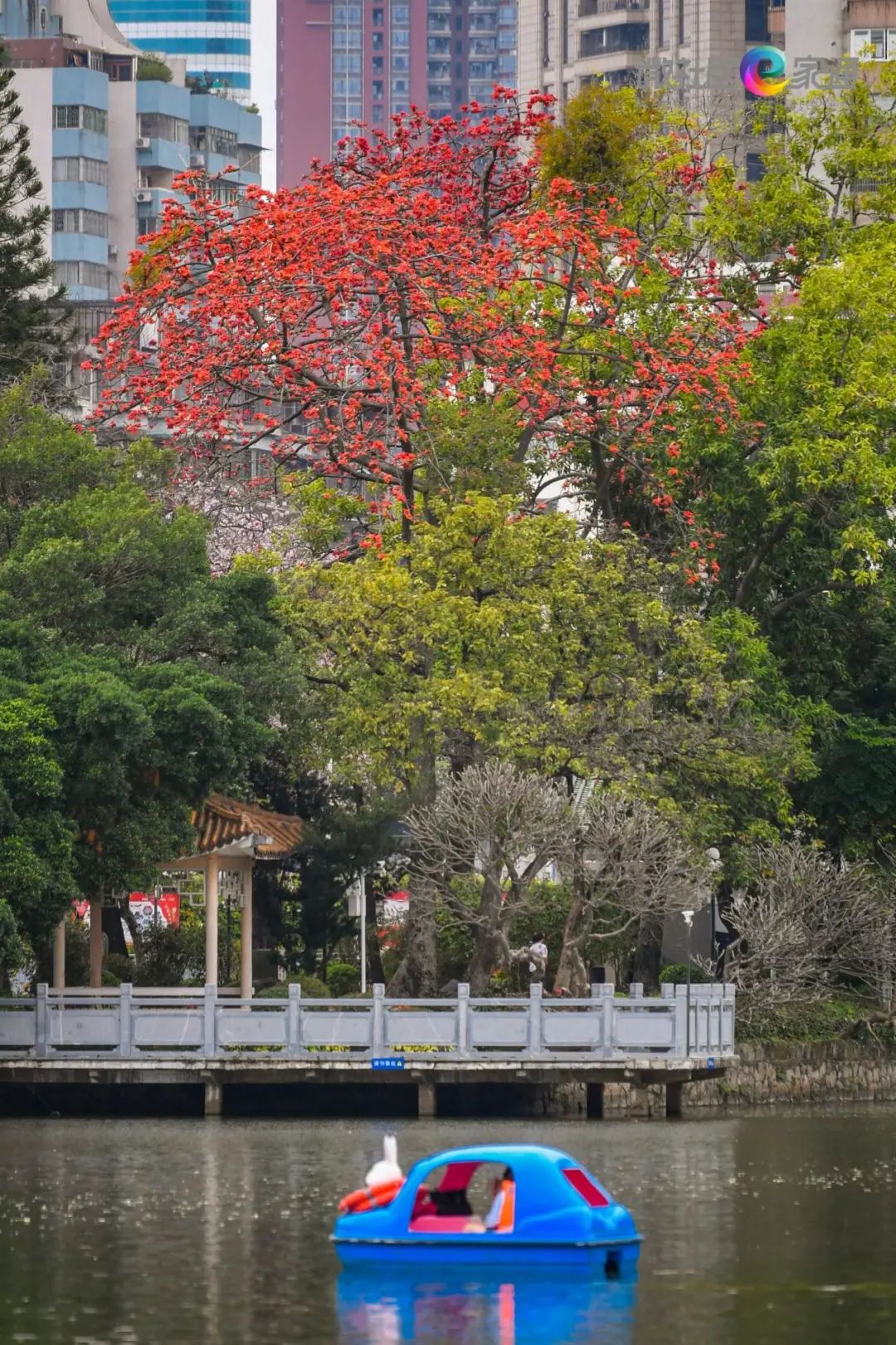 从沿江东路的碧道往马路对面走去,便来到东山湖公园。公园里呈现出一派春意盎然的景象。林荫道上成片的洋紫荆花迎来盛花期,粉红色的花朵随风摇曳,洋洋洒洒挂满枝头。九曲桥旁壮硕的木棉树上挂着一串串木棉花,远远望去红艳似火,在蓝天白云的映衬下格外耀眼夺目。游客们在湖上泛舟,听鸟语闻花香。