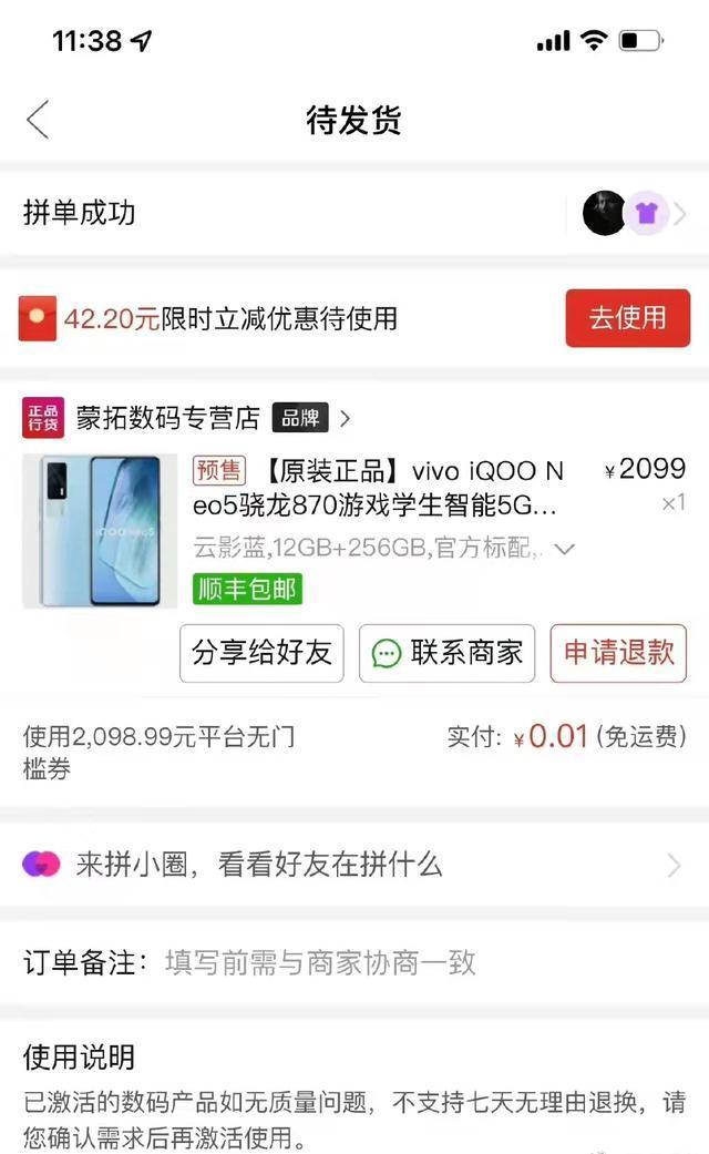 同时,砍价成功的页面显示,他获得了一张无门槛商品券,需要支付0.01元才能购买这款手机。“在直播间里的两个小时,一直显示都是砍价不成功。我好奇的是,现在究竟是我自己砍价成功了,还是拼多多官方关注到了此事,刻意‘送’了我一台手机?