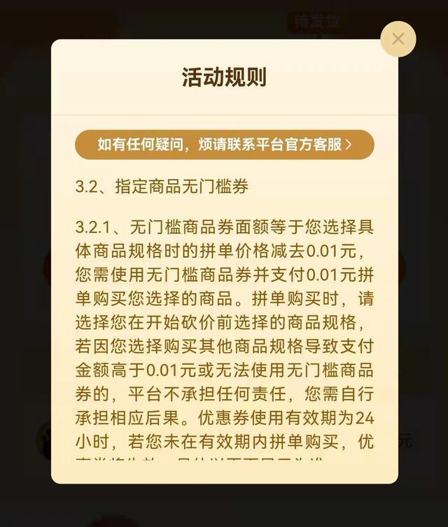 拼多多称,砍价成功后,将对活动资格进行审核,审核成功后将为用户生成商品订单,或是发放一张无门槛商品券,或提供现金打款,具体以实际发放形式为准。