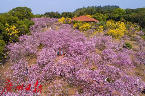 3月的广州繁花似锦,近日南沙区大岗镇的十八罗汉山森林公园内樱花、黄花风铃木和木棉花盛放,吸引了不少市民游客拍照打卡。十八罗汉山森林公园位于大岗镇东南角,是南沙西部少有的一片森林丘地。十八罗汉山位主轴长3.1公里,宽约2公里,总面积5048亩,海拔最高点是127.3米。十八罗汉山共有3个主要出入口,对群众完全免费开放,划分成:金屏山景区、罗汉塔景区、莲塘坪景区、石磨山景区、罗汉岭景区、仙庙景区、深坑景区、自然保护区等8个景区,是南沙区大岗镇及周边群众休闲、健身、娱乐、摄影、旅游的首选。