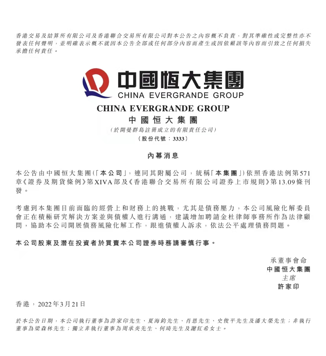 同时,中国恒大、恒大物业、恒大汽车公告称,暂缓披露2021年度业绩报告。当日,中国恒大还发布公告称,考虑到集团目前面临的经营上和财务上的挑战,尤其是债务压力,公司风险化解委员会正在积极研究解决方案并与债权人进行沟通,建议增加聘请金杜律师事务所作为法律顾问,协助公司开展债务风险化解工作,跟进债权人诉求,依法公平处理债务问题。