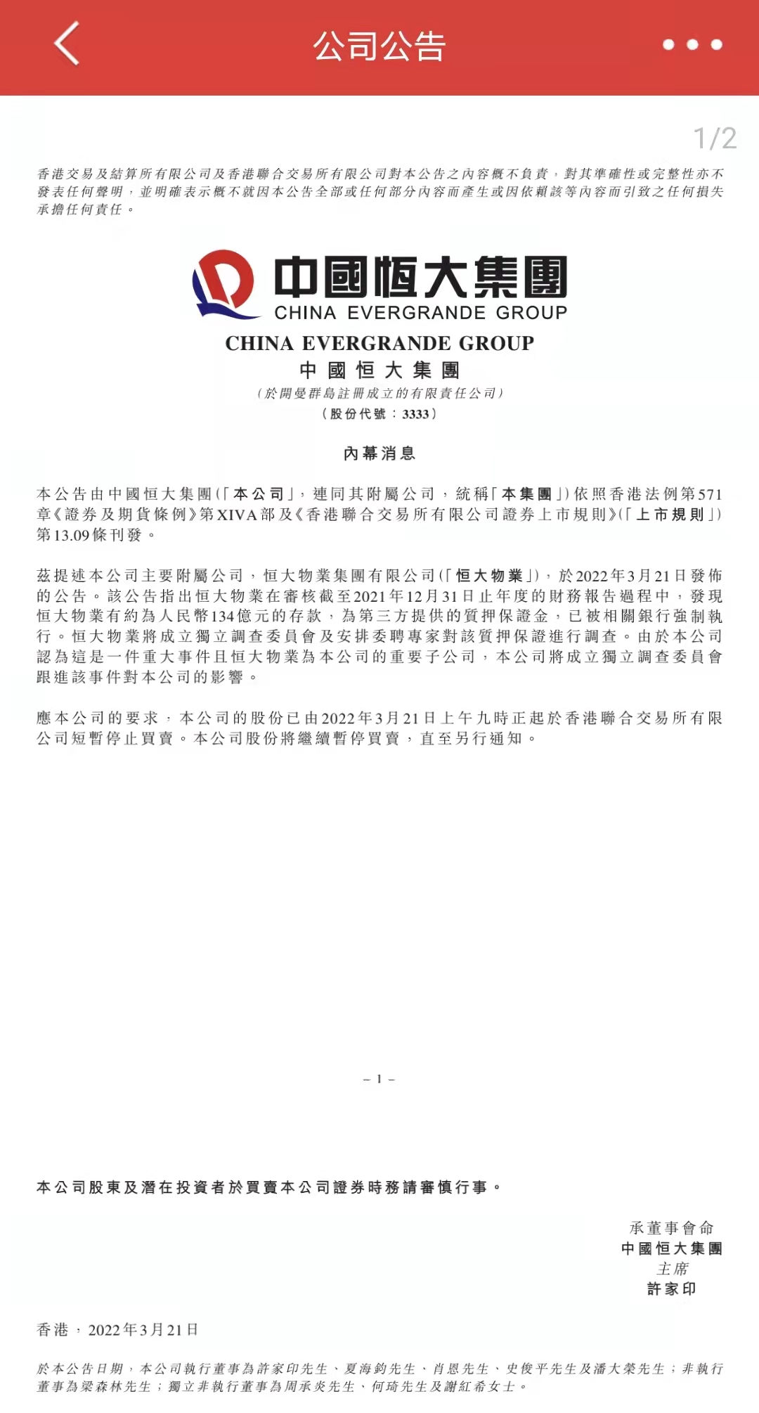 3月22日早间,中国恒大发布公告称,恒大物业在审核截至2021年12月31日止年度的财务报告过程中,发现恒大物业有约为人民币134亿元的存款,为第三方提供的质押保证金,已被相关银行强制执行。公告表示,恒大物业将成立独立调查委员会及安排委聘专家对该质押保证进行调查。由于本公司认为这是一件重大事件且恒大物业为本公司的重要子公司,公司将成立独立调查委员会跟进该事件对本公司的影响。