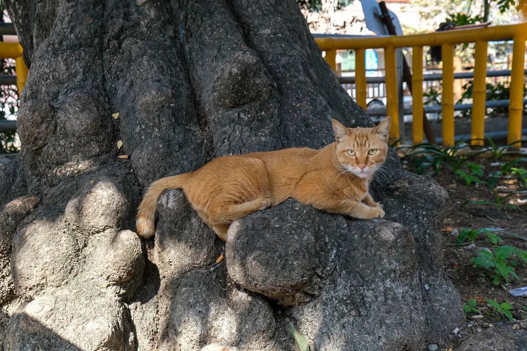 古树粗壮的枝干,是村里小猫咪的天然“猫爬架”,小猫们可以依偎在大树的怀抱里安睡,也能爬上枝头俯视自己的“领地”,大树给予了小猫一个休息玩耍的乐园,小猫也日日值守在树下守护着大树。