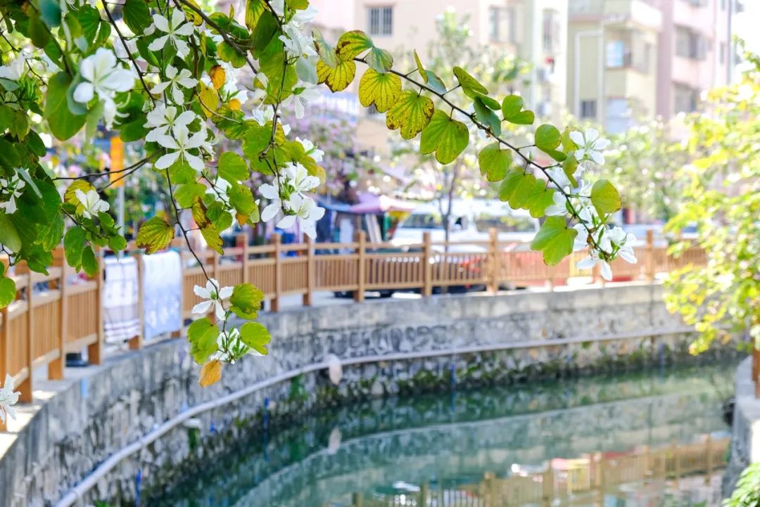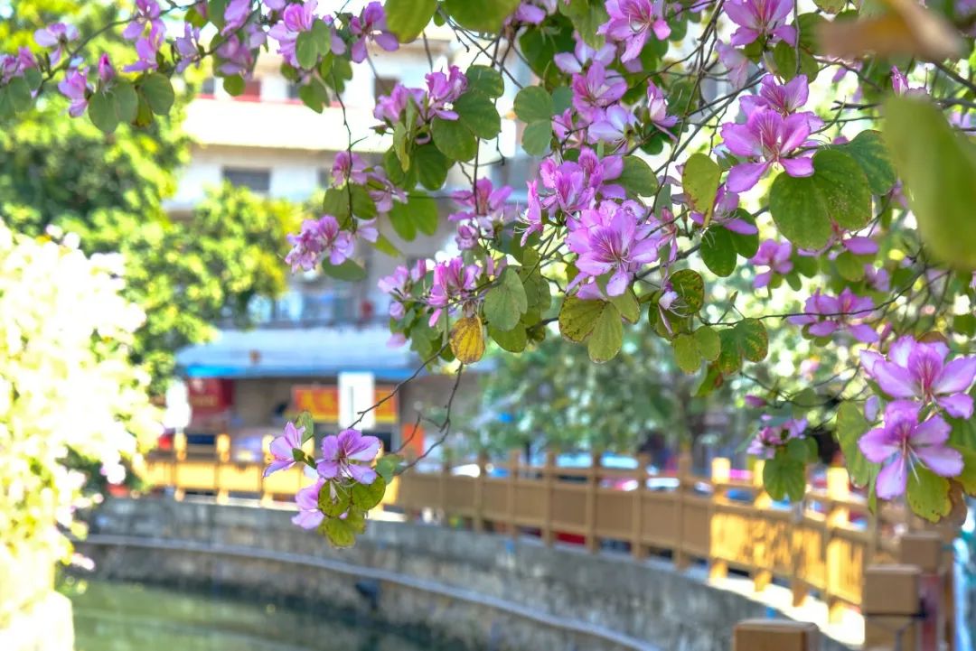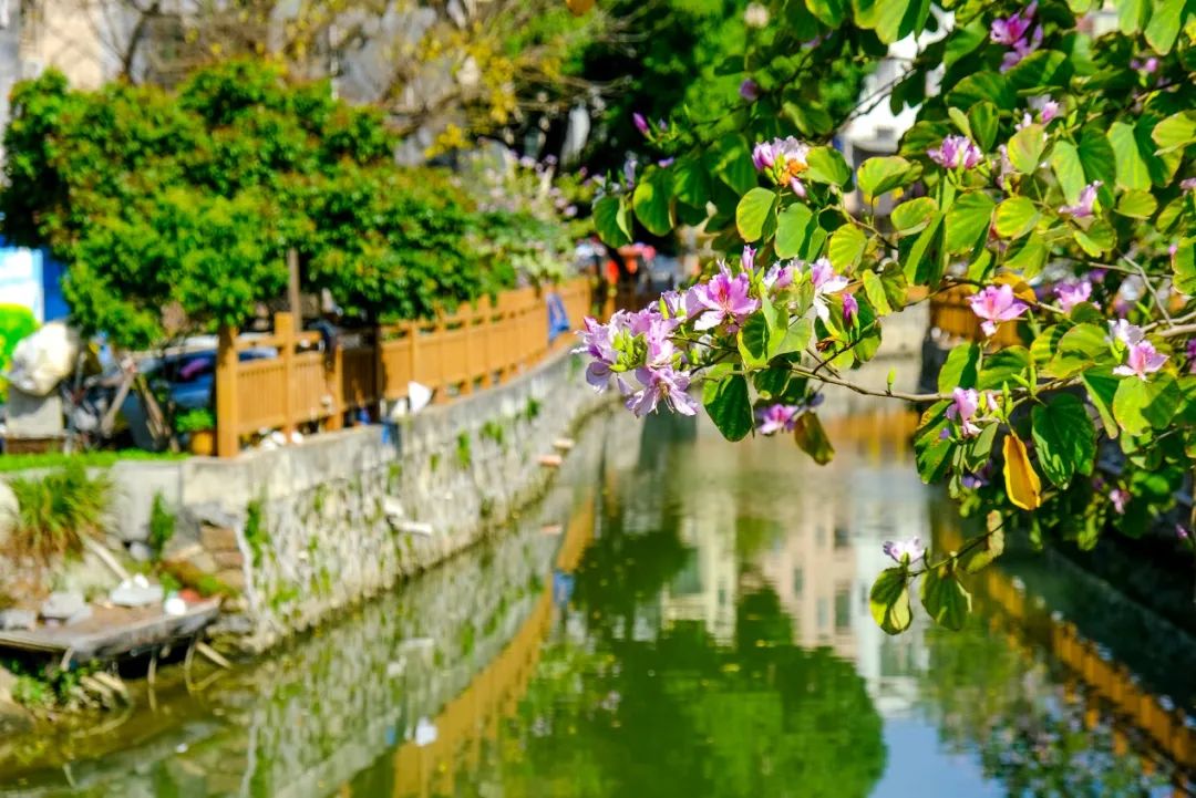 经过“一河两岸”河涌治理工程整治后的南漖涌,两岸鲜花簇拥,像蝴蝶一样飞舞的白紫荆和在绿叶中怒放的紫荆花纷纷怒放。
