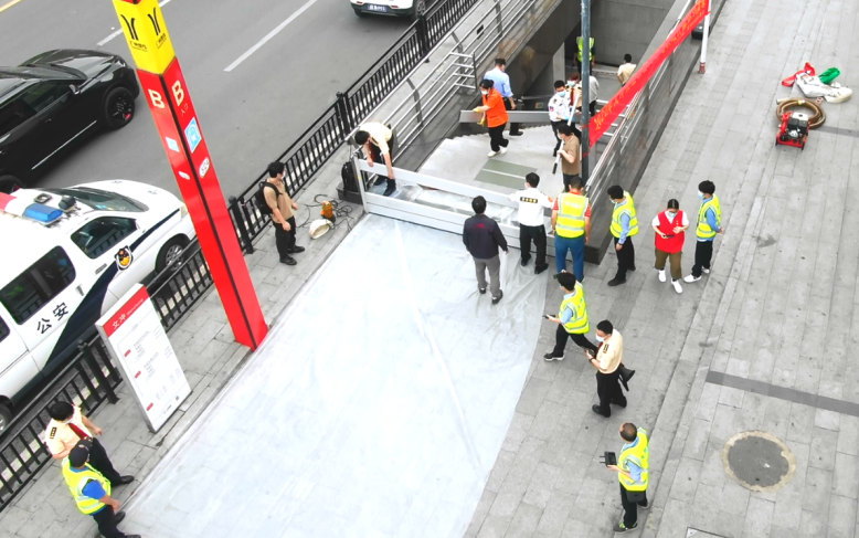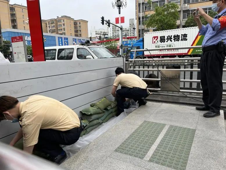 街道工作人员与地铁站工作人员齐心协力、行动迅速,第一时间筑牢防汛安全网,防治积水倒灌,并使用排涝设备进行加速排水。