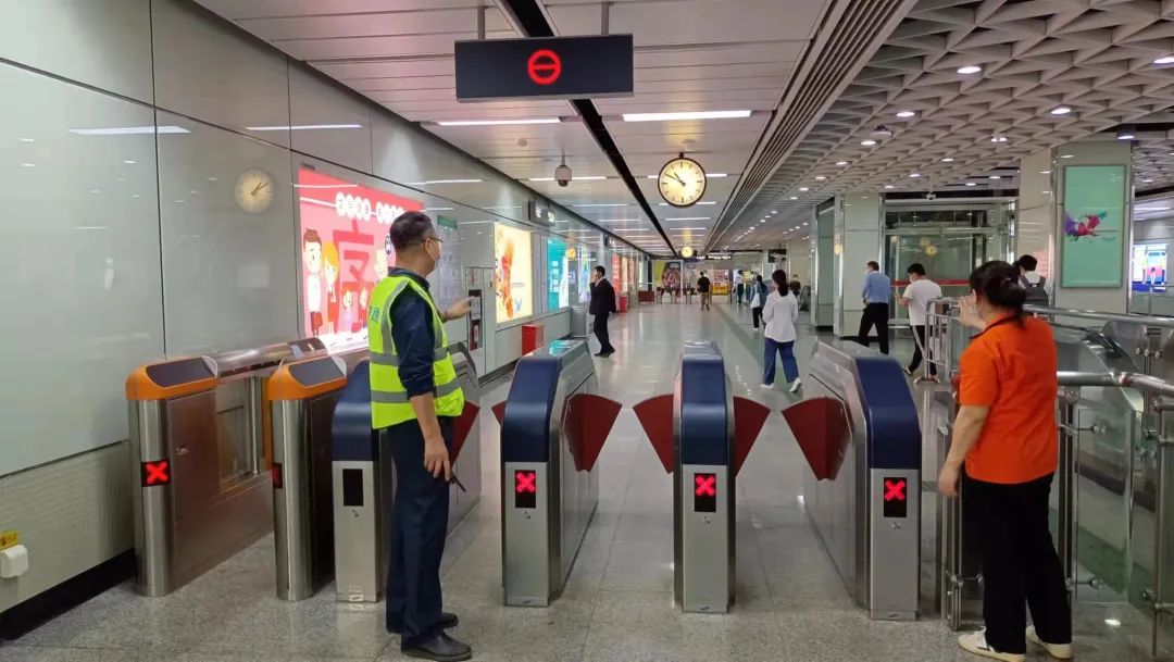 地铁站内协助工作人员疏导、指引群众到其他安全出口。