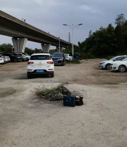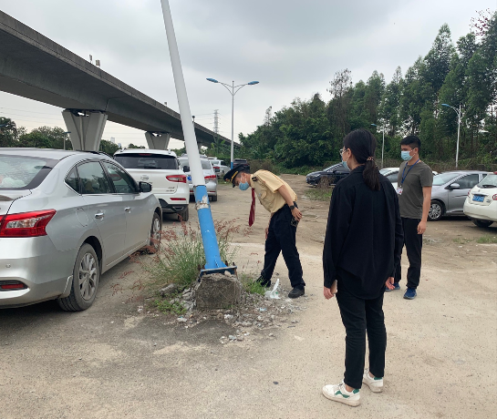巡查队伍在地铁四号线低涌站外一处正开放使用的停车场内发现一盏路灯的水泥底座有明显被撞毁的痕迹,该盏路灯灯杆已发生严重倾斜,存在极大的安全隐患。