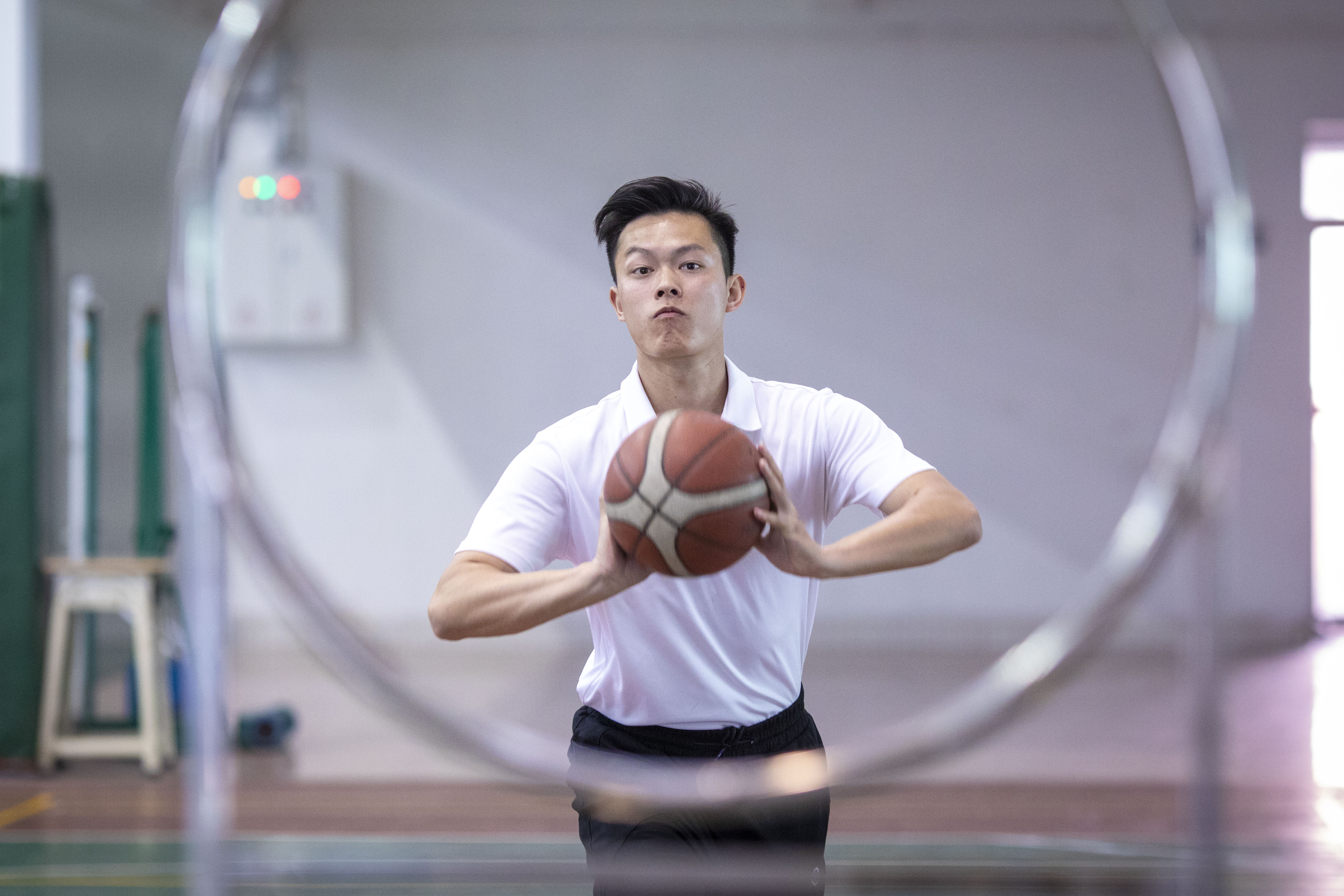 (广州市第五中学体育老师欧阳俊演示体育中考篮球项目。)