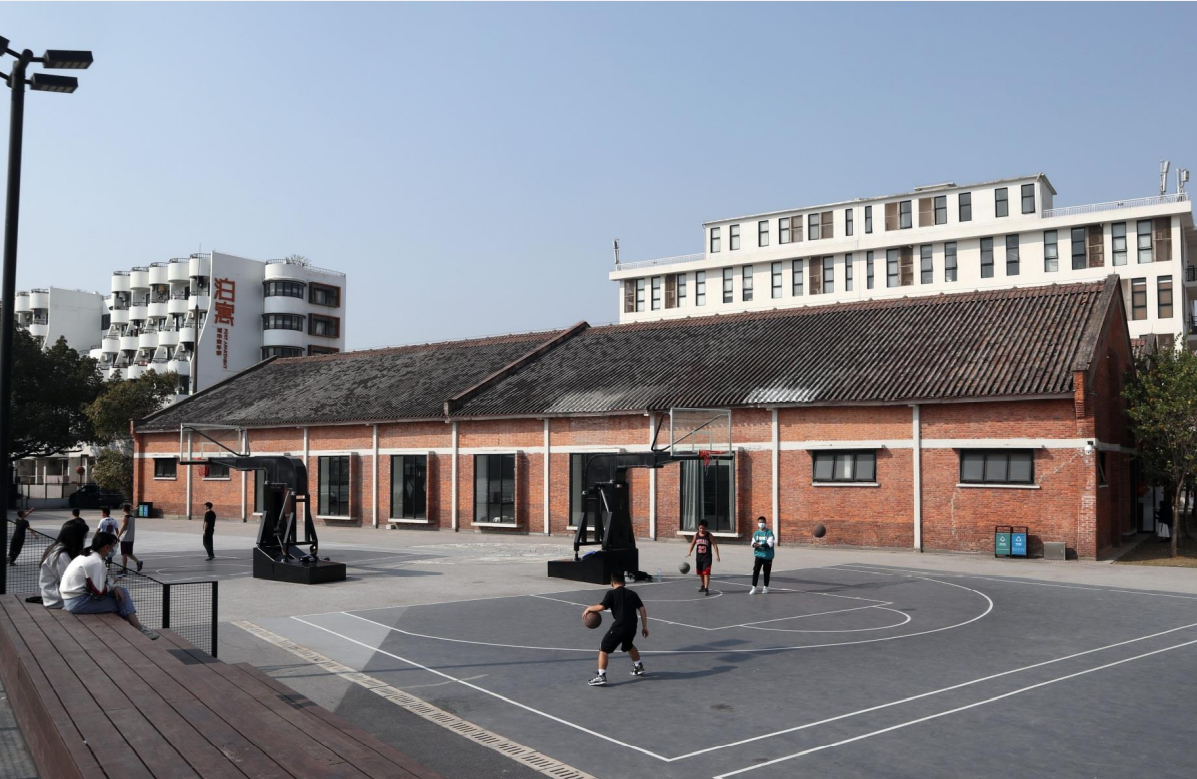 3、海珠区南洲街的大干围仓库旧址,核心价值要素是建筑立面、钢筋混凝土门式刚架结构。该建筑建于1950年代初,是珠江后航道沿线仓储设施的典型。该建筑采用的钢筋混凝土门式刚架结构,结构造型流畅,在广州的仓库建筑中较为少见。现活化为易建联篮球训练中心。(注释:门式刚架结构是一种结构形式,特征是柱顶端与梁之间刚性连接)