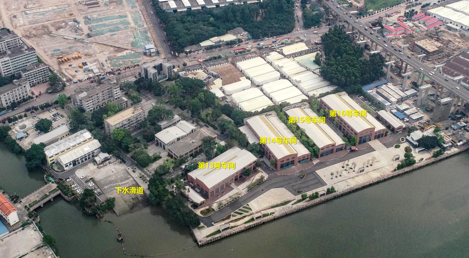 11、黄埔区红山街的文冲船厂的1号、2号船坞,核心价值要素是船坞主体结构。文冲船厂是中华人民共和国成立后建设的大型造船基地,1号船坞为我国自行设计的华南地区第一座万吨级修船干坞,2.5万吨级的2号船坞建成时是华南地区最大干船坞,两座船坞体现了造船核心工艺及华南造船工业技术发展水平。