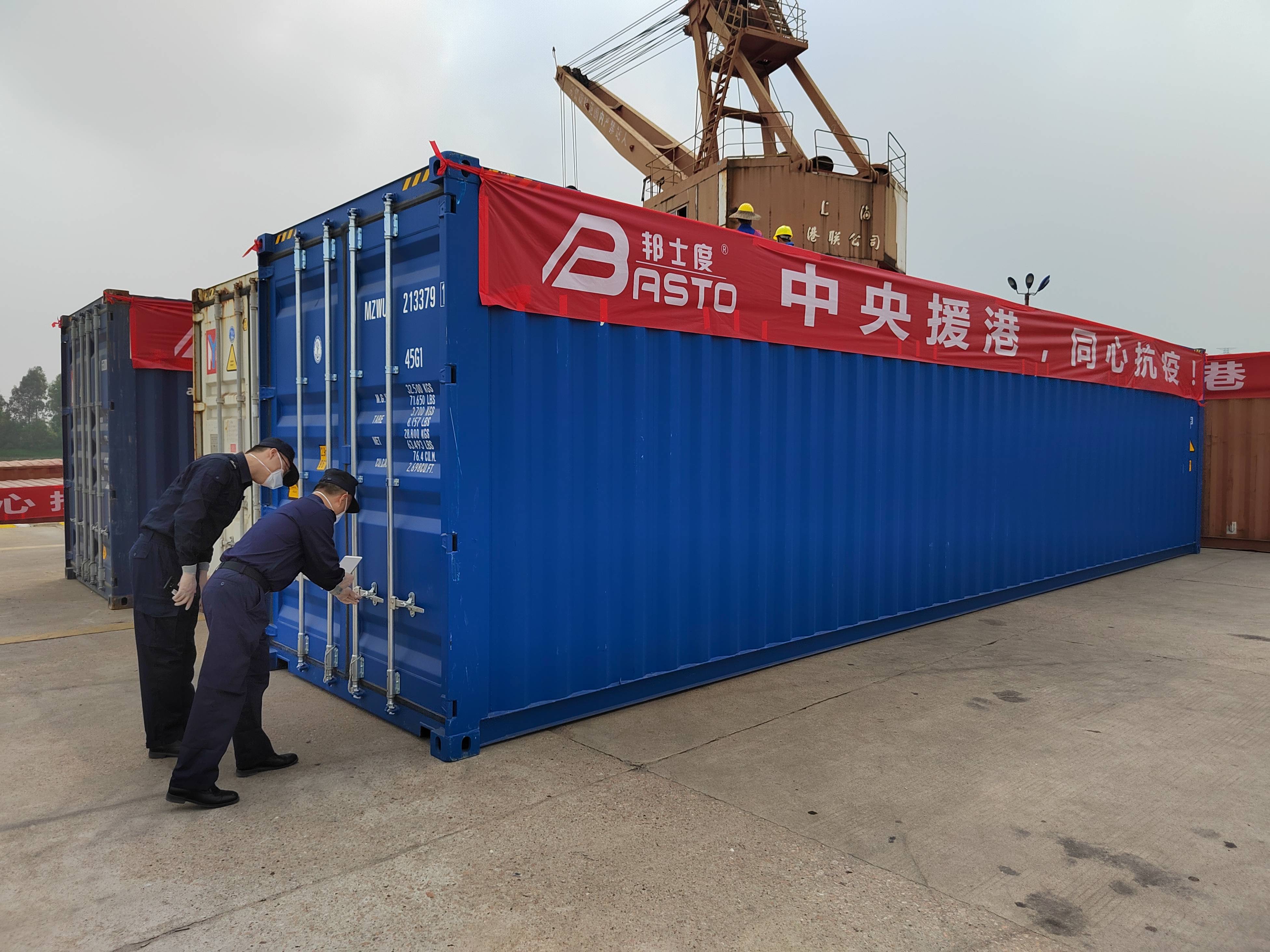 3月22日,5个装载着54万件医用隔离面罩的货柜装运上船,经广州海关所属花都海关关员快速验放后,这批物资通过“花都港-香港”水运专线快速发往香港。