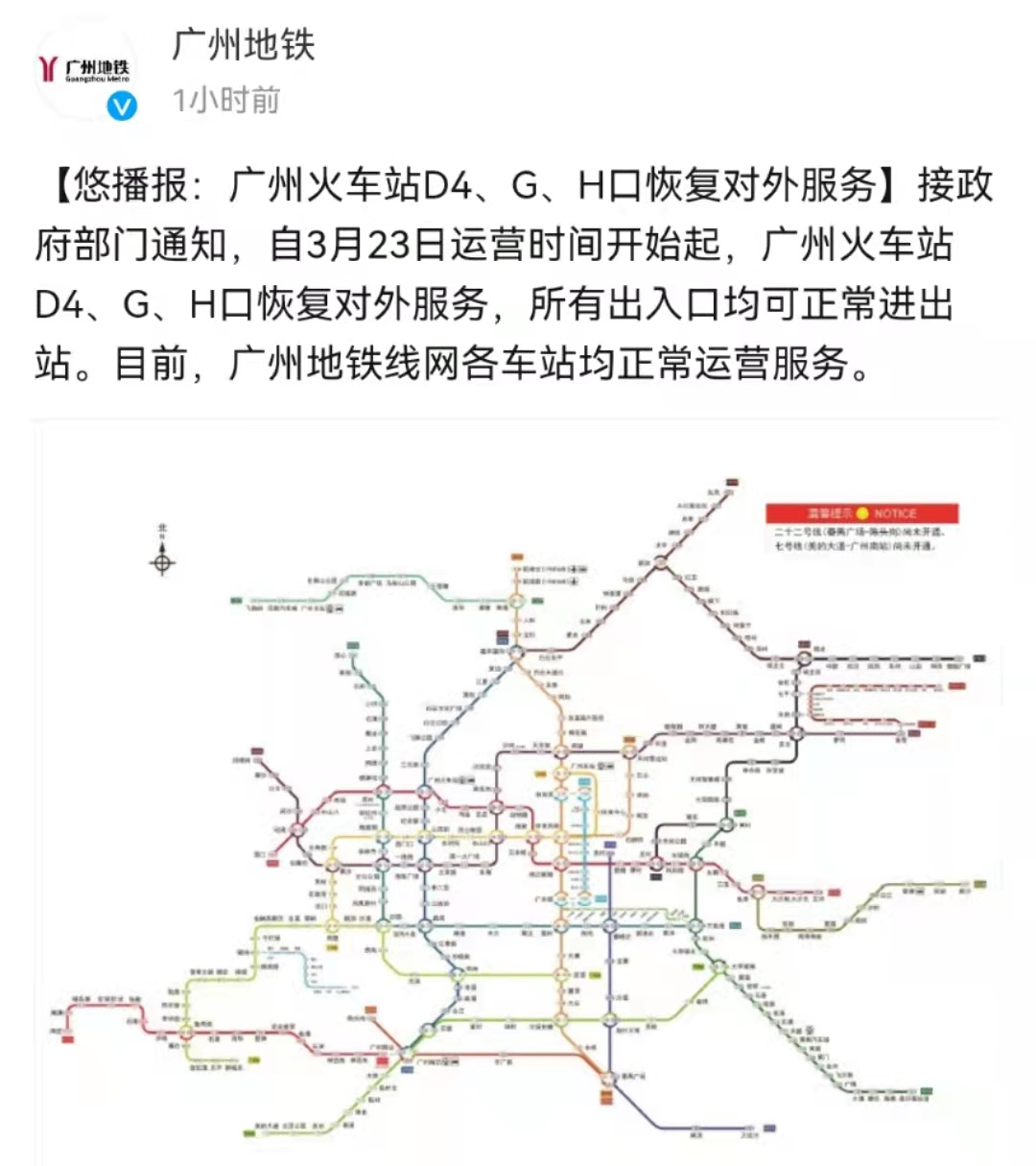 广州地铁通报,接政府部门通知,自3月23日运营时间开始起,广州火车站D4、G、H口恢复对外服务,所有出入口均可正常进出站。目前,广州地铁线网各车站均正常运营服务。