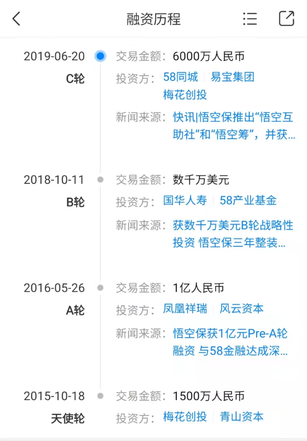 从融资来看,悟空保创立后即获梅花创投、青山资本、唱吧创始人陈华共计1500万元人民币天使投资,2016年5月获凤凰祥瑞资本领投1亿元人民币Pre-A轮投资,2018年9月,获得58集团和国华人寿数千万美元B轮融资。另据天眼查,悟空保已于2019年6月完成C轮融资,投资方包括58同城、易宝集团、梅花创投,投资金额6000万人民币。