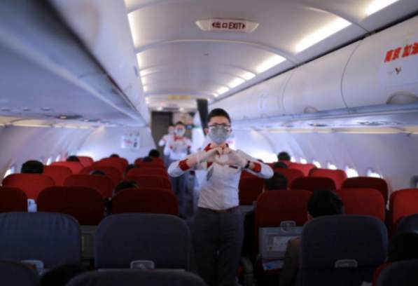 湖南航空客舱服务人员疫情期间为旅客做安全演示。(图片来自湖南航空公司官网)