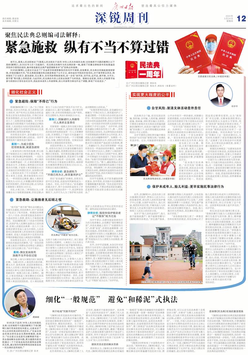 针对该《解释》,记者近日采访了广东金桥百信律师事务所的冯宇平律师,在他看来,民法典总则编起着提纲挈领、价值统摄的作用。“民法典最显著的特点就是体现了公平正义、倡导诚实守信的价值导向,对于普罗群众而言,特别细化了正当防卫、紧急避险、见义勇为、自甘风险等制度规则,进一步在‘扶不扶、劝不劝、追不追、救不救、为不为、管不管’等问题上亮明态度;与此同时,民法典在内容上还突出强调了与时俱进。随着社会发展,自然人开始更早地参与到部分正常社会社交中,因此在未成年人年龄限制、胎儿利益等方面也作出了调整,体现了社会进步。”