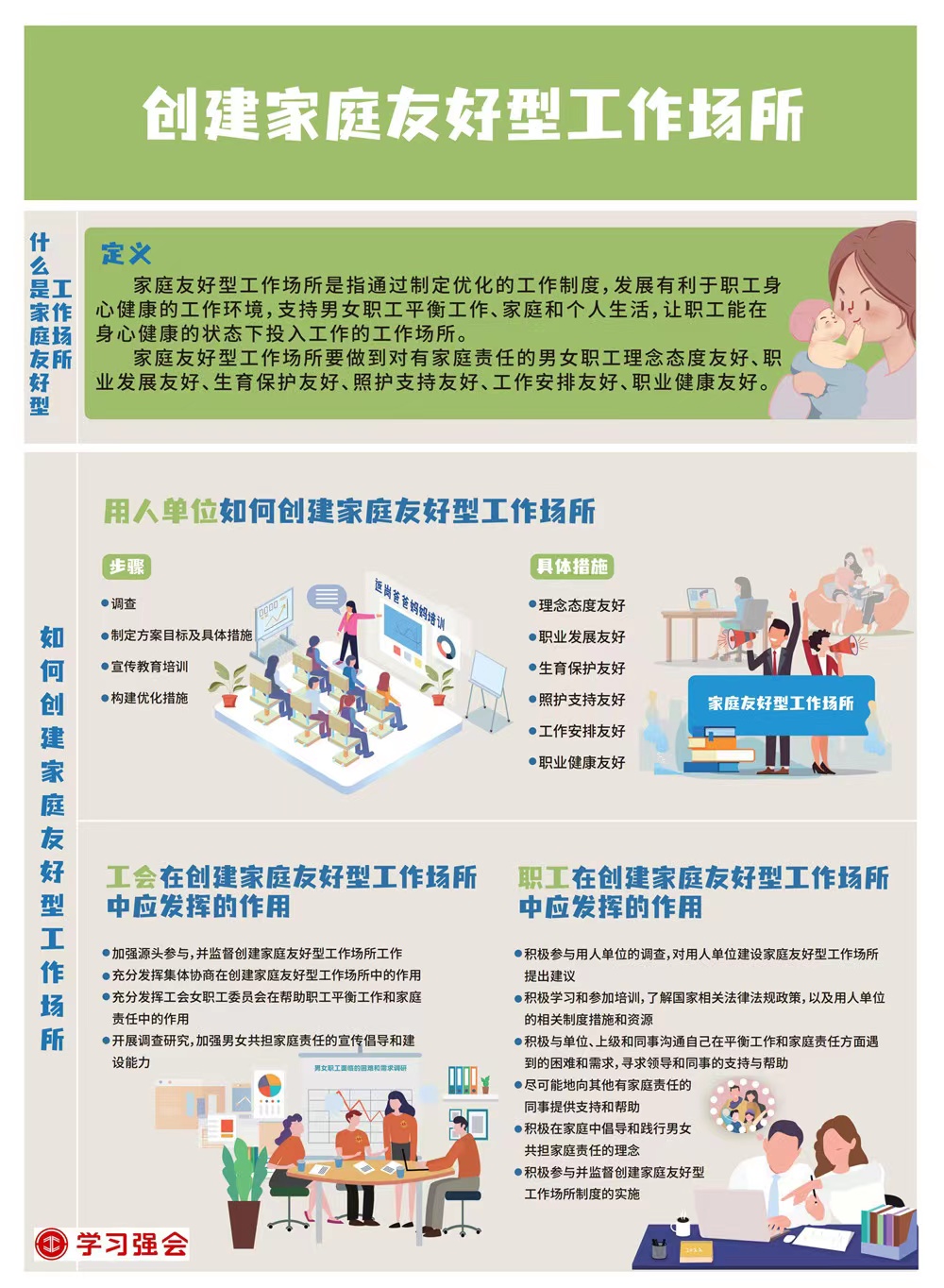 什么是家庭友好型工作场所?专题中的动漫微课中将其解释为指通过制定优化的工作制度,发展有利于职工身心健康的工作环境,支持男女职工平衡工作、家庭和个人生活,让职工能在身心健康的状态下投入工作的工作场所。