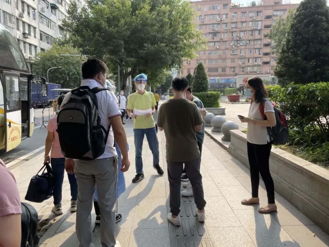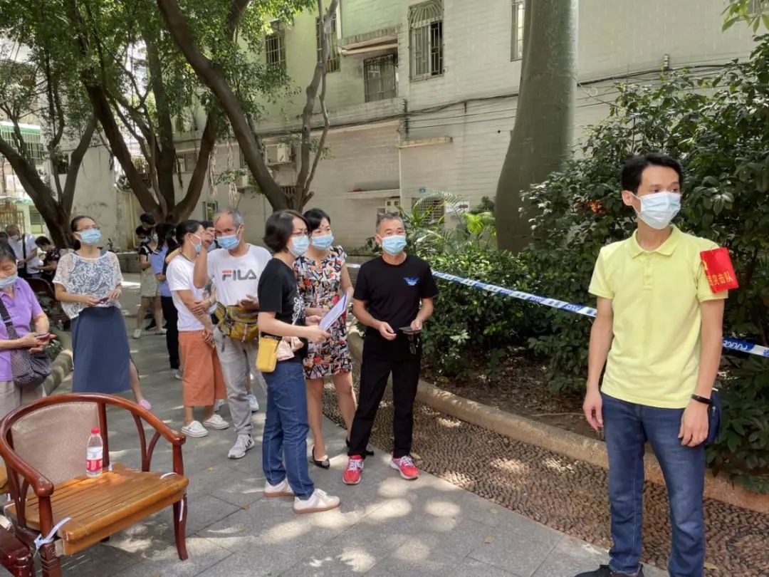 王周亮(左二)与红棉老兵志愿者一起参加核酸检测志愿服务。