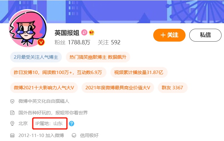 “英国那些事儿”IP属地在广东,但所属公司在南宁 来源:微博截屏