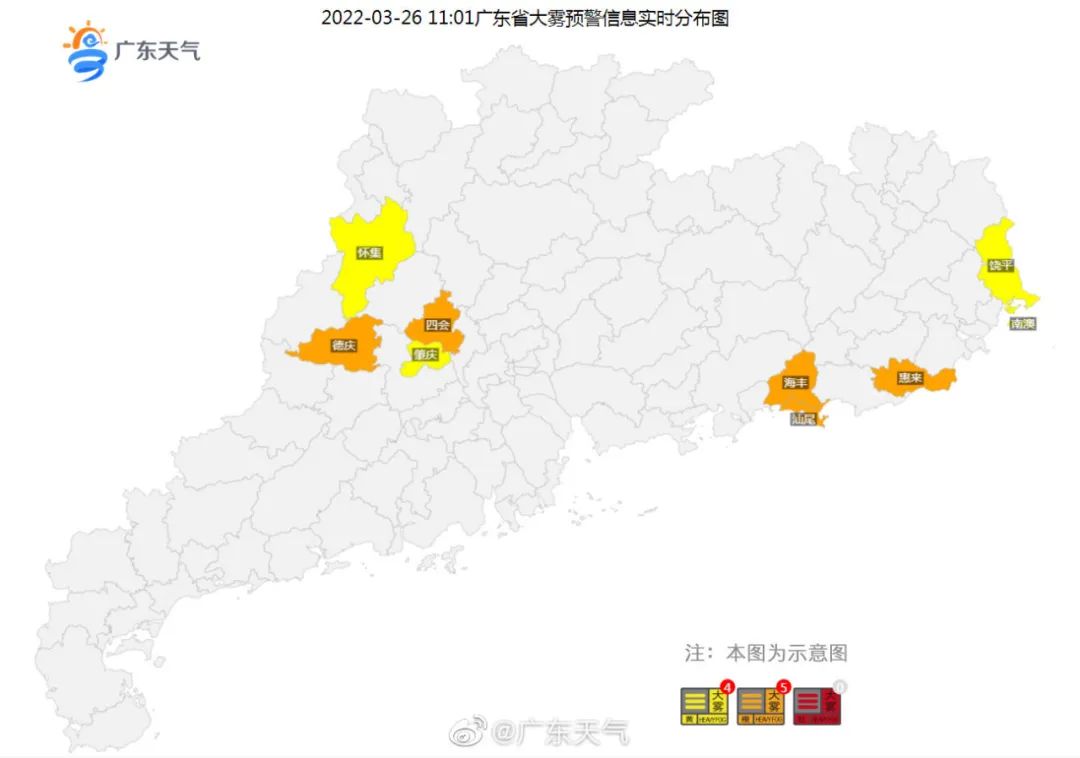 全省有10个大雾预警信号生效中 其中大雾橙色预警信号有五个: 分别是德庆、四会、海丰、汕尾、惠来; 翁源和连平暴雨黄色预警信号生效中; 粤北有18个市县寒冷黄色预警信号生效中。