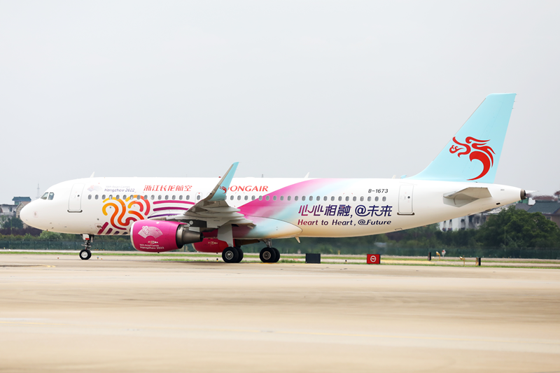A plane painted with patterns characterizing the Hangzhou Asian Games lands at Xiaoshan International Airport in Hangzhou, Zhejiang province on June 15, 2020. [Photo/Xinhua]