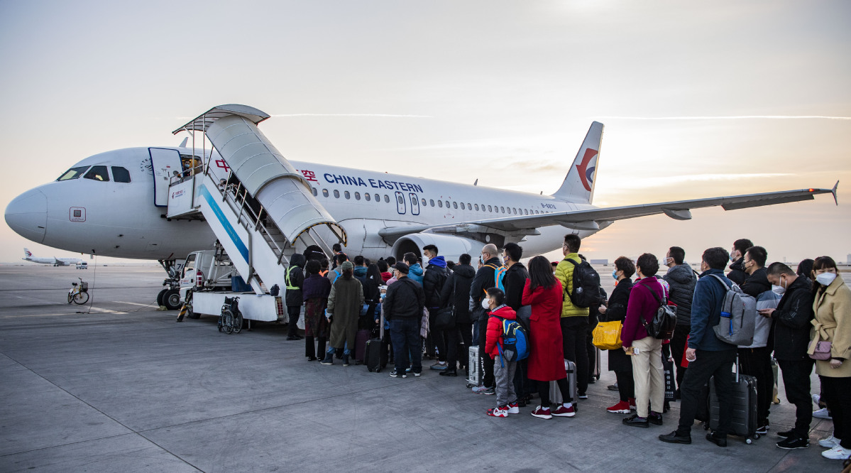 Passengers board a plane at Xianyang International Airport in Xi'an, Shaanxi province on Feb 6, 2021. [Photo by Yuan Jingzhi/For China Daily]