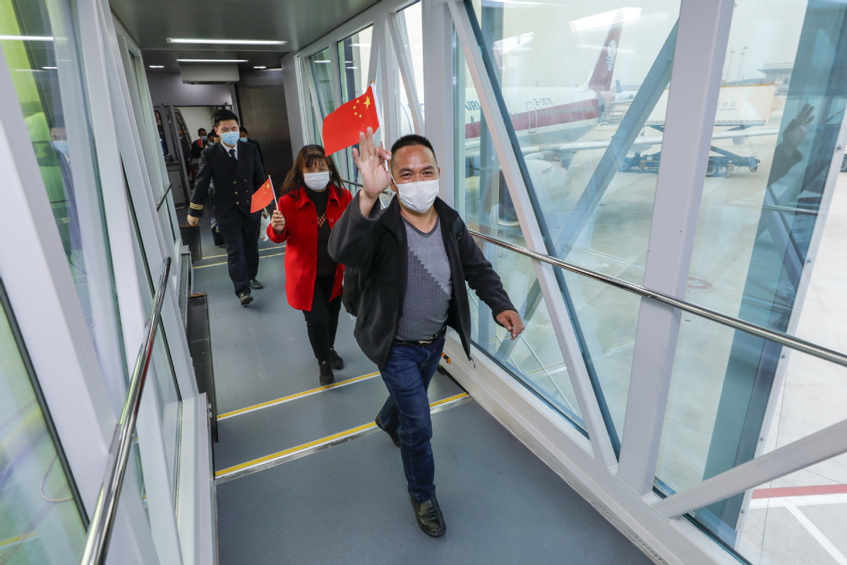 An air hostess sees passengers off at the gateway after a Juneyao Airlines flight arrives at the Chengdu Shuangliu International Airport in Chengdu, Sichuan province, on Aug 1, 2019. [Photo/China News Service]