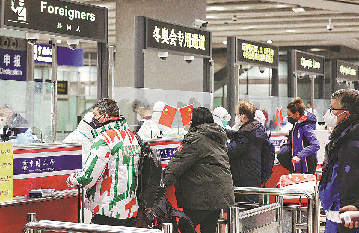 Passengers wait in line at immigration checkpoints as they prepare to depart from Beijing Capital International Airport on Games-related flights Feb. 21, 2022. [Photo by WANG YANG/FOR CHINA DAILY]