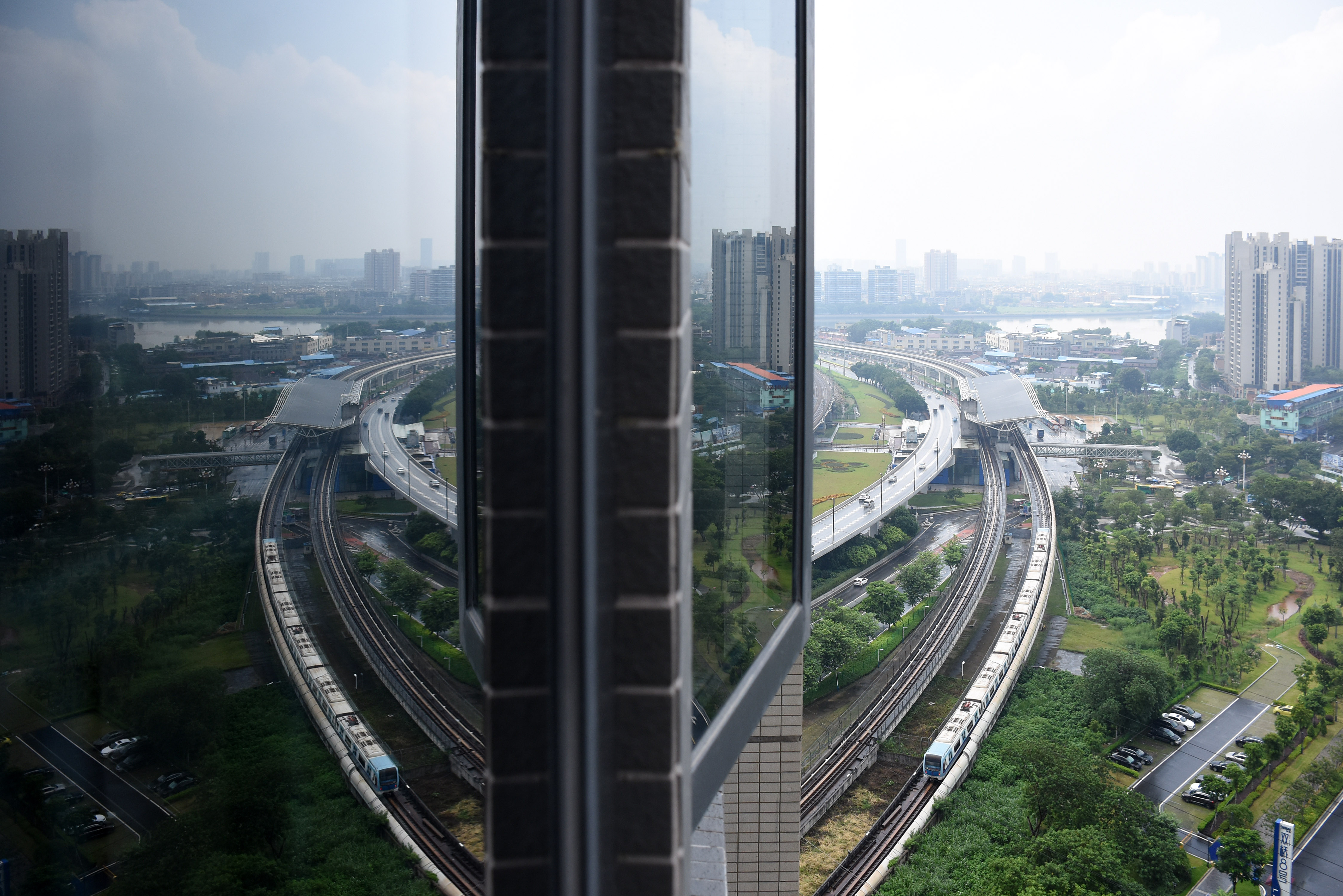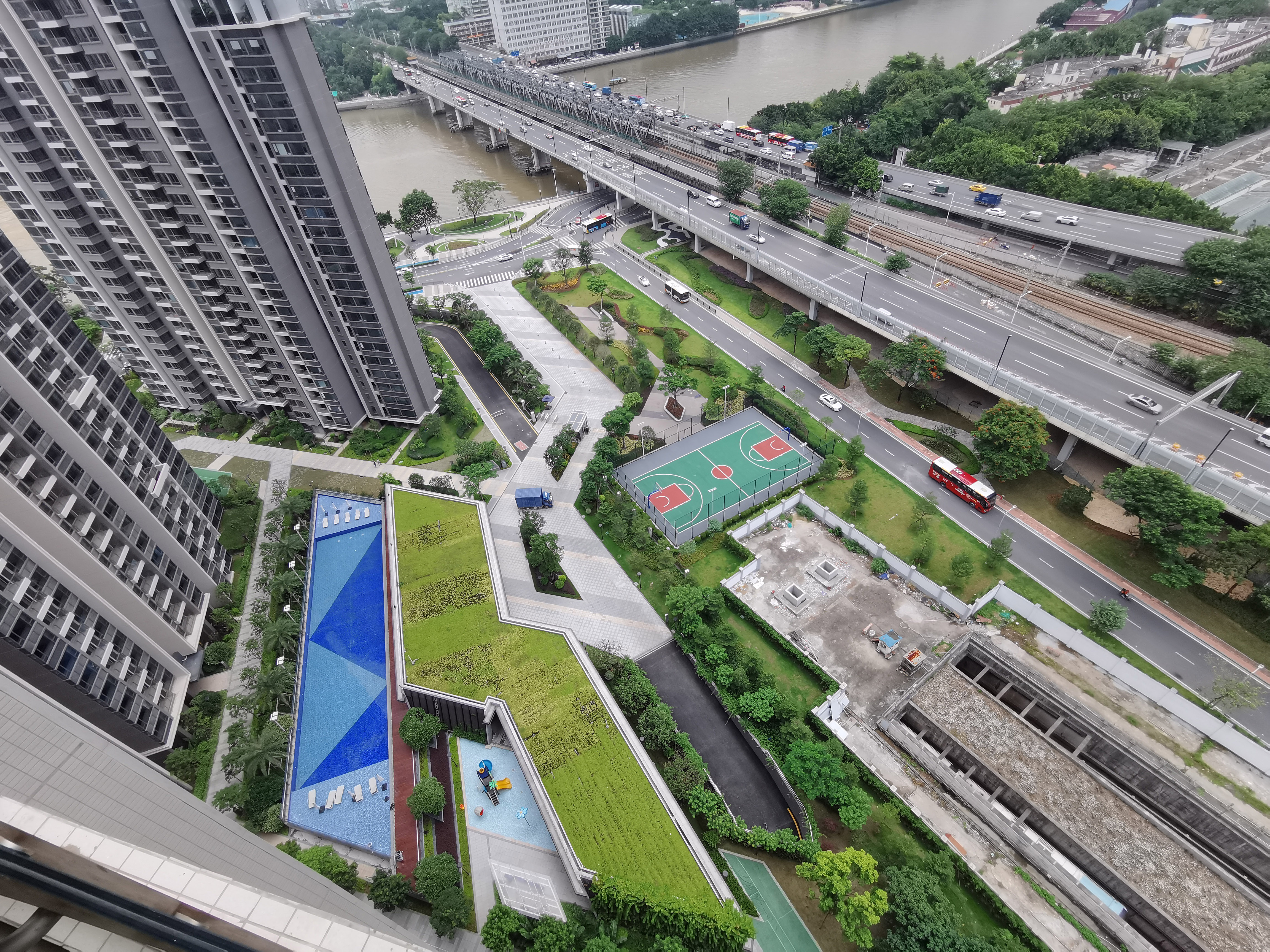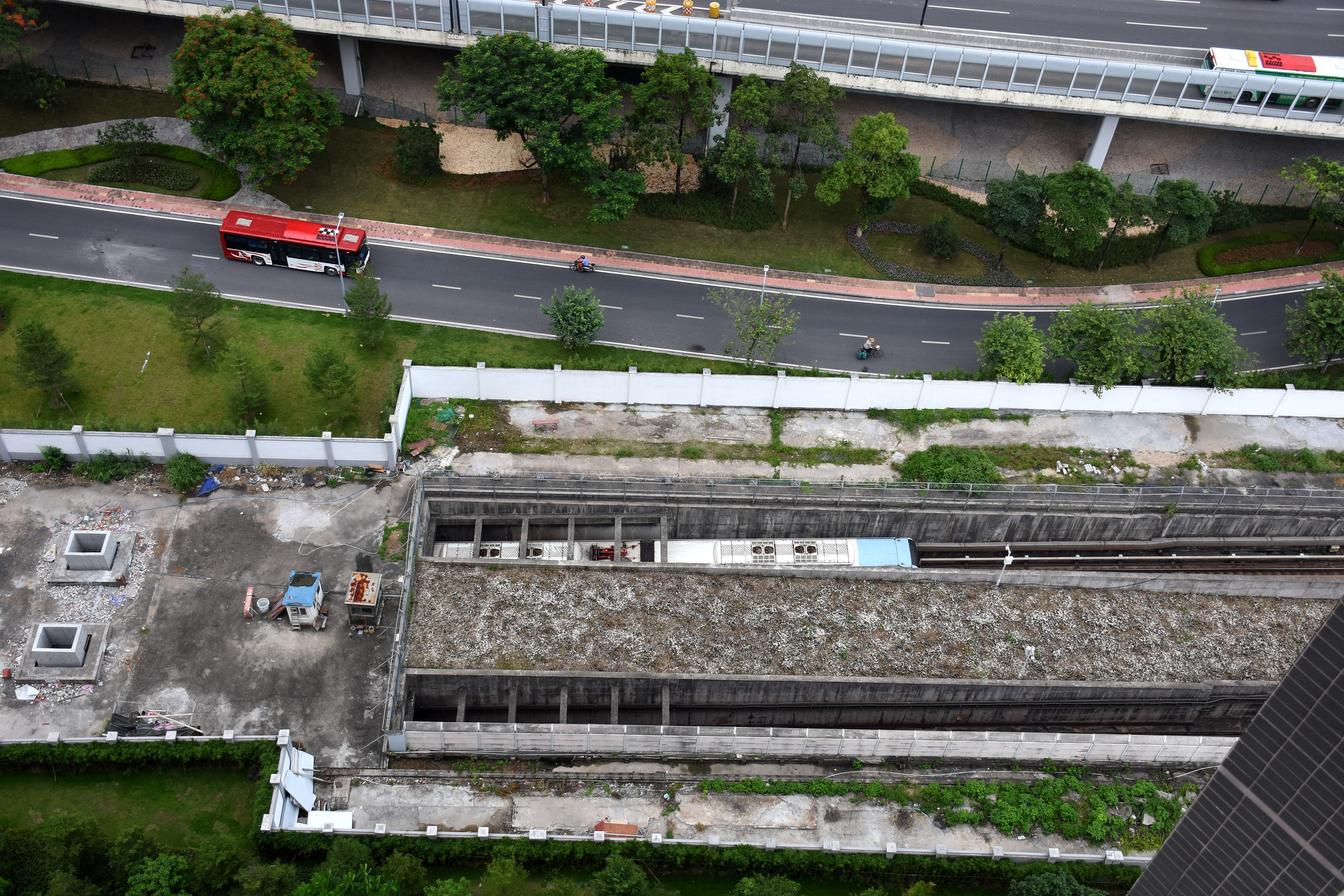 坦尾地铁站东侧出口封闭式声屏障工程,位于坦尾站-中山八站区间敞开段。这是地铁5号线高架与地下过渡的区段,和双桥8号小区直线距离最短不足30米。每隔3到5分钟,都会有列车在此经过。除了地铁,楼盘南面还有公铁两用的珠江大桥,汽车和火车每天穿梭。